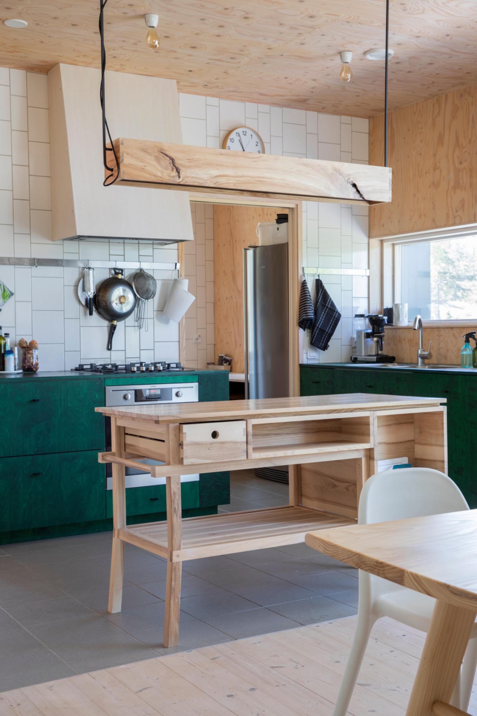 Puumateriaalien käyttö on nousussa, sillä keittiöön halutaan nyt kestäviä, hengittäviä luonnonmateriaaleja. Kaapistojen hinnassa on mahdollista säästää teettämällä valmiisiin runkoihin puiset ovet, jotka voi sitten pintakäsitellä monin eri tavoin. Tämän kodin keittiössä on Ikean rungot ja asukkaan itsetekemät koivuvaneriovet. Keittiön seinä on pinnoitettu mestarinöljyllä käsitellyllä kuusivanerilla ja välitila laatoitettu pystyladonnalla tavallisesta valkoisesta laatasta. Saareke ja riippuvalaisin ovat myös asukkaan tekemät.