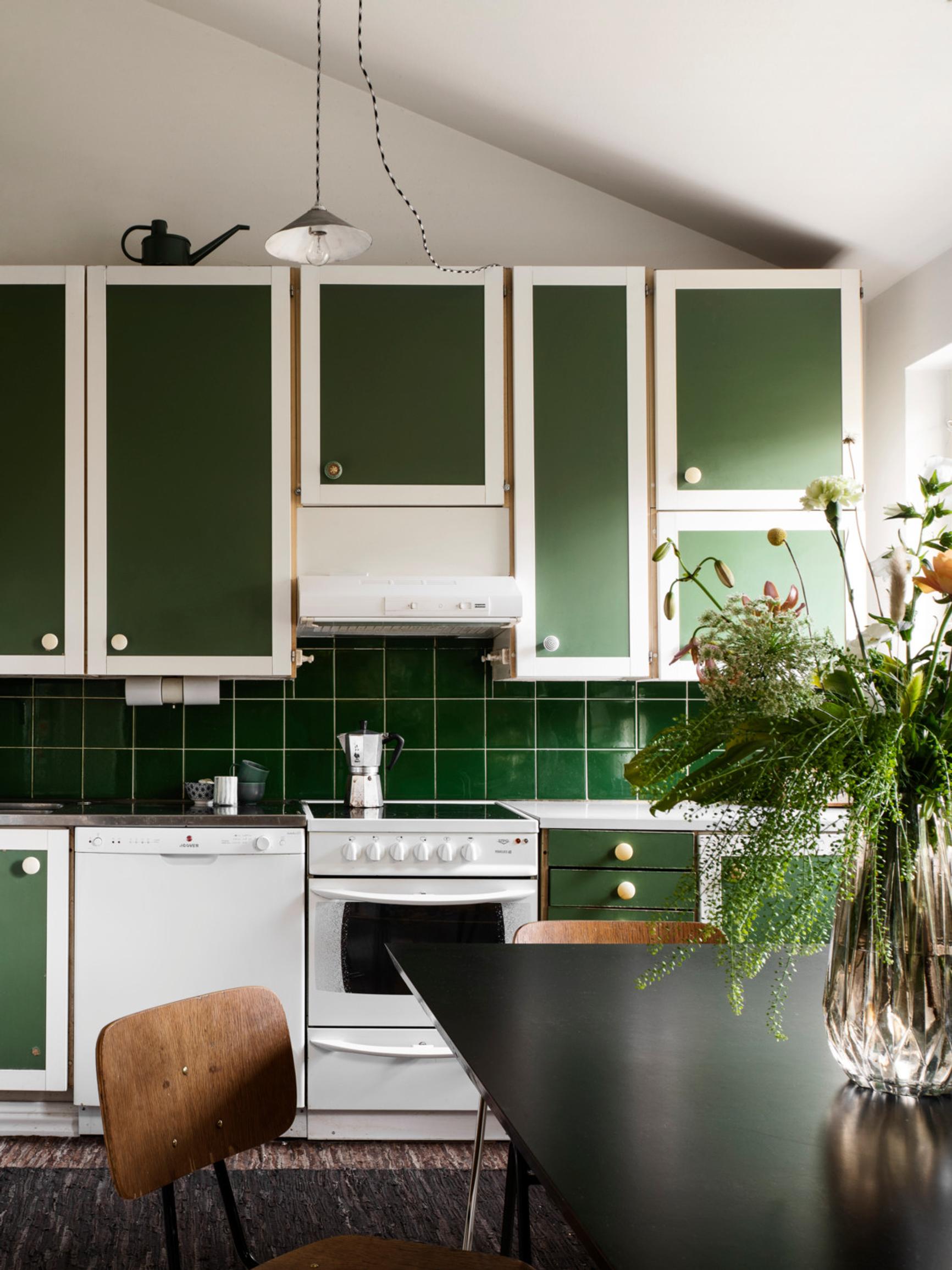 Säilytä alkuperäiset kaapistot, jos ne ovat riittävän hyvässä kunnossa. Niin tekivät tämän rivitalokodin asukkaat. Vaikka 70-luvun retrokeittiö ei toiminnallisuudeltaan vastaa nykyvaatimuksia, on vihreissä kaapistoissa ja kaakeleissa sen verran luonnetta, että asukkaat ovat pitäneet keittiön ennallaan. Vintagekaapistoja voi löytää edullisesti Tori.fi:stä tai oman kaupunginosan Facebook-kirpputoriryhmästä.