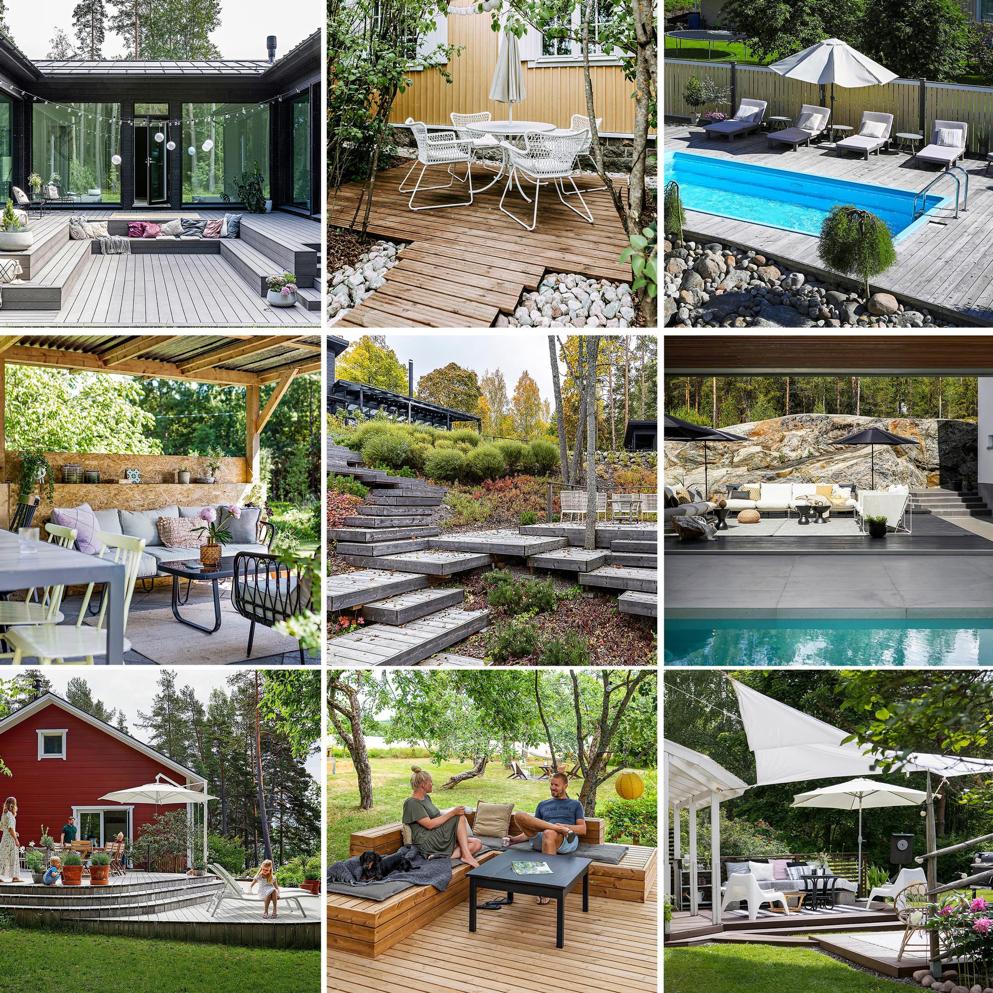 Terassista on moneksi! Miten olisi yllätyksellisen kaartuva tai eri tasoihin rakennettu oleskelupaikka? Terassi-inspiraatiota voi hakea myös hotellin allasalueesta tai amfiteatterista. Kokosimme yhteen erilaisille pihoille sopivat ratkaisut.