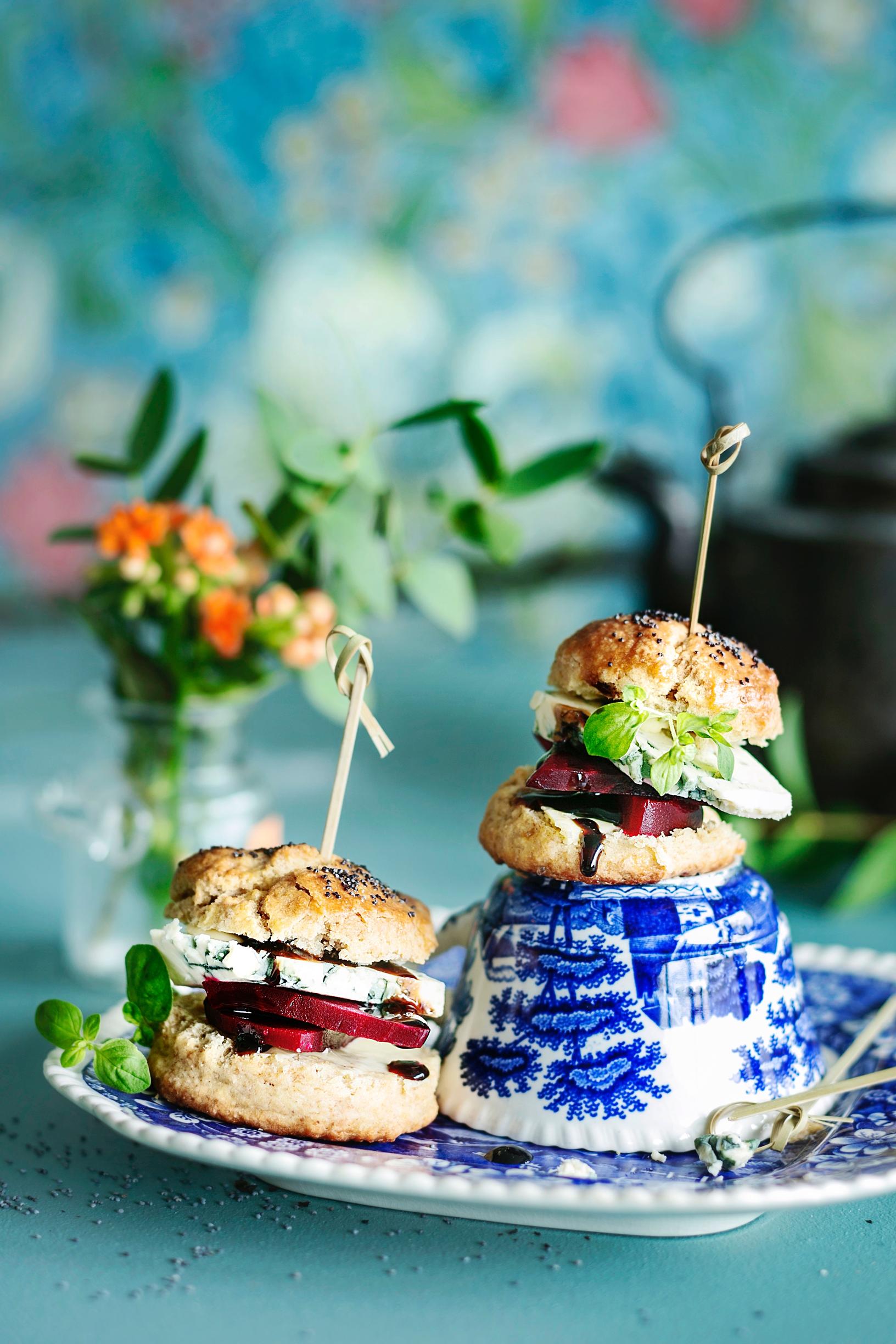 Jos haluat kokeilla jotakin uutta, leivo valkosuklaiset skonssit ja täytä ne villisti keitetyllä punajuurella ja sinihomejuustoviipaleella. Tuore oregano ja balsamisiirappi viimeistelevät suolaisenmakean täytteen.