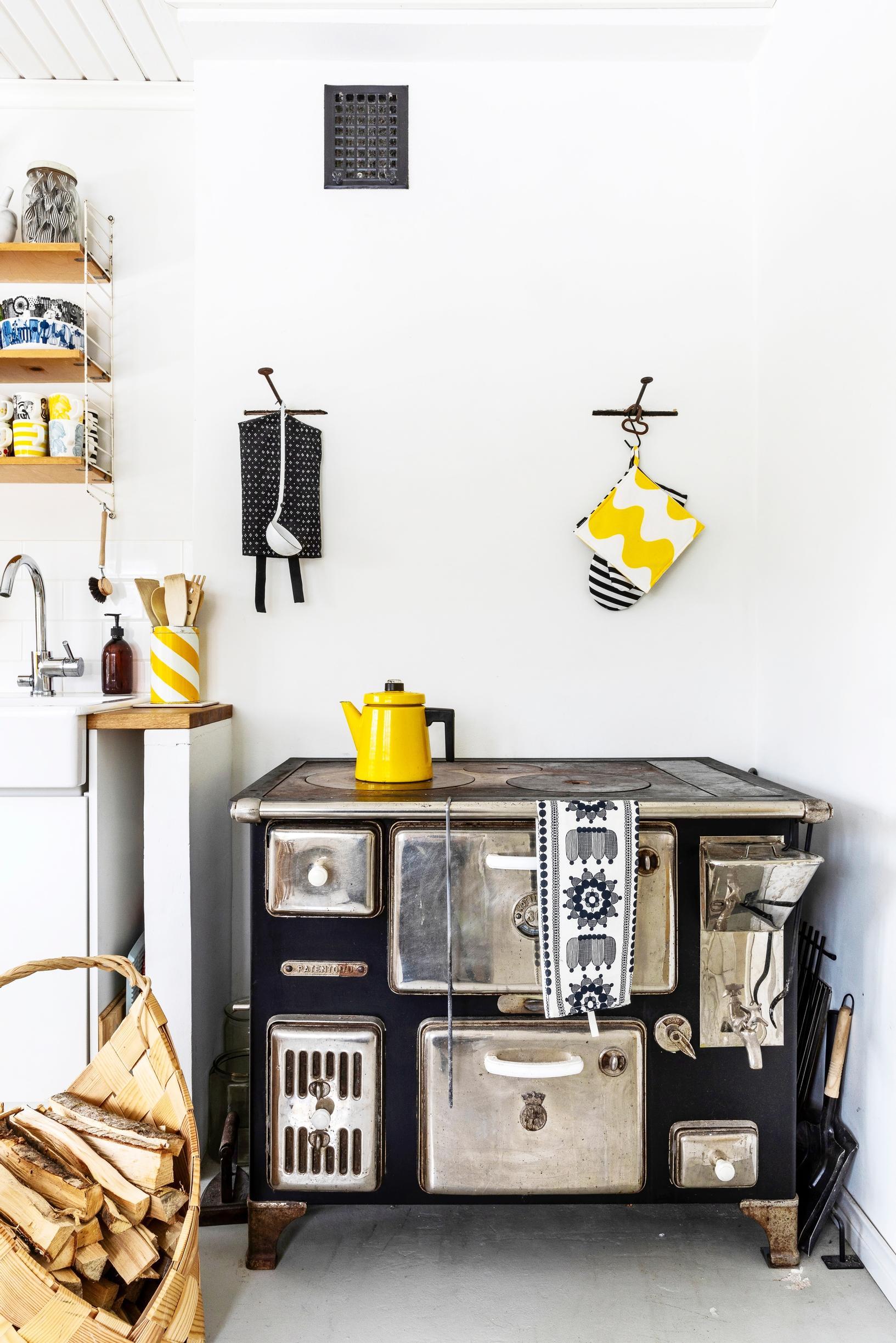 Anna: Keittiössä oli oranssit kaapit, ja yläkerta oli sininen. Olemme tuoneet remontissa sisustukseen noita samoja värejä, mutta tapettien ja esineiden avulla. Keittiö kruunattiin Porin Valun Kotiliesi 30 -puuhellalla.