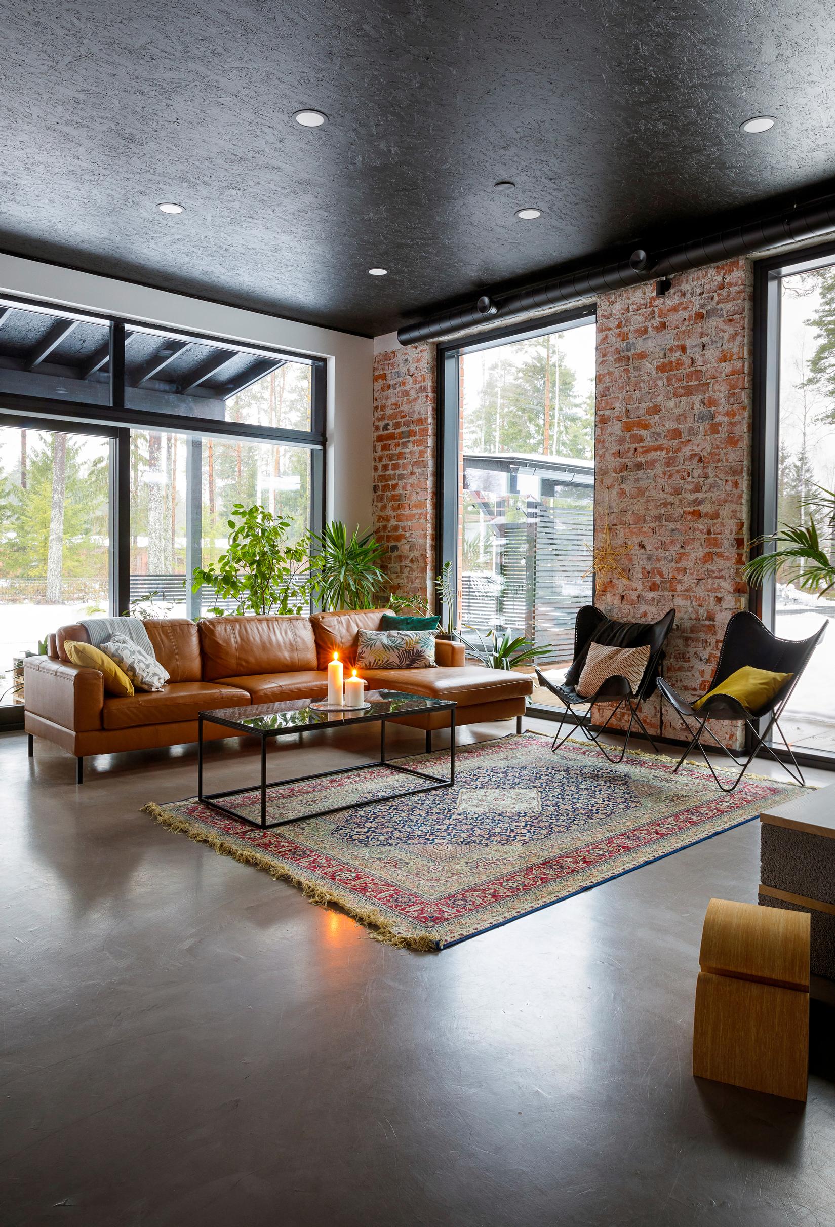 Emilia ja Mikael ovat tyytyväisiä tekemiinsä ratkaisuihin. He halusivat säilyttää tiettyä tehdastunnelmaa, ja siinä onnistuttiin tiiliseinän, mikrosementtilattian ja mustan katon avulla.