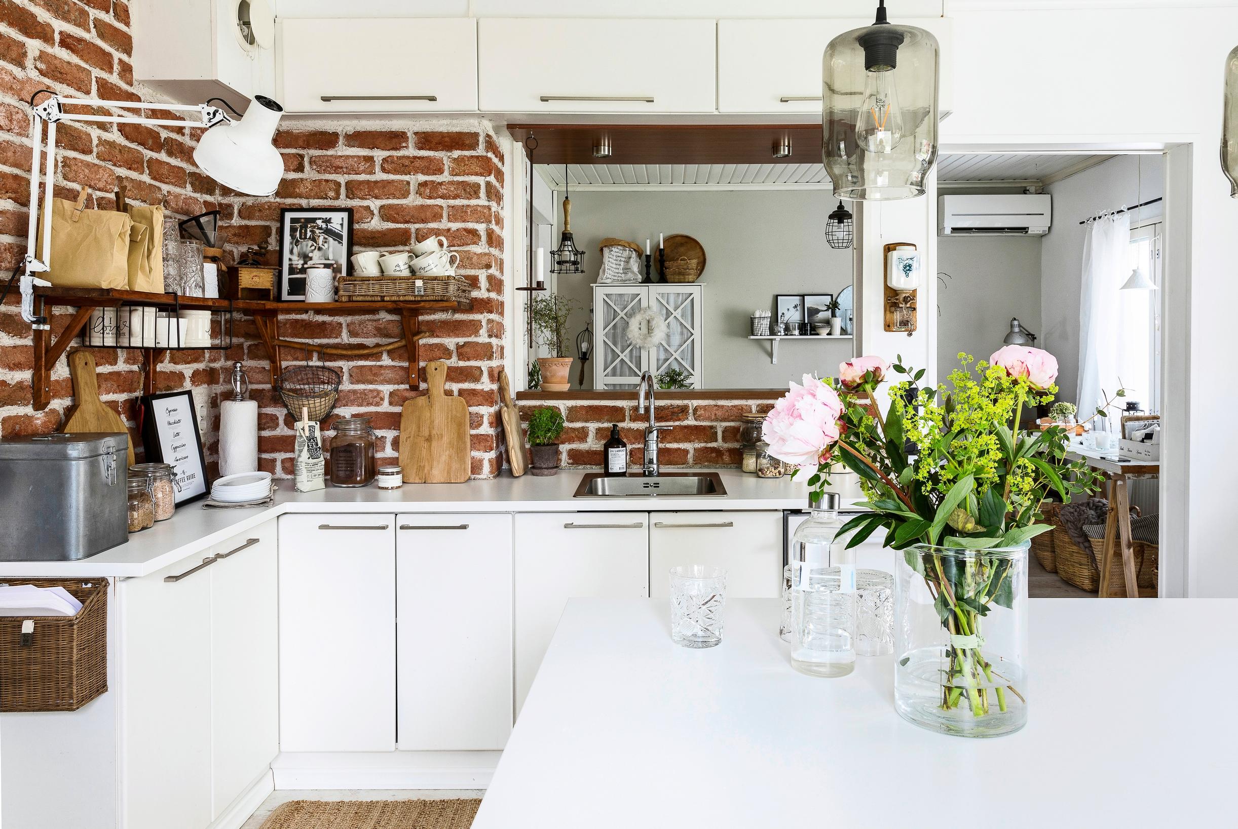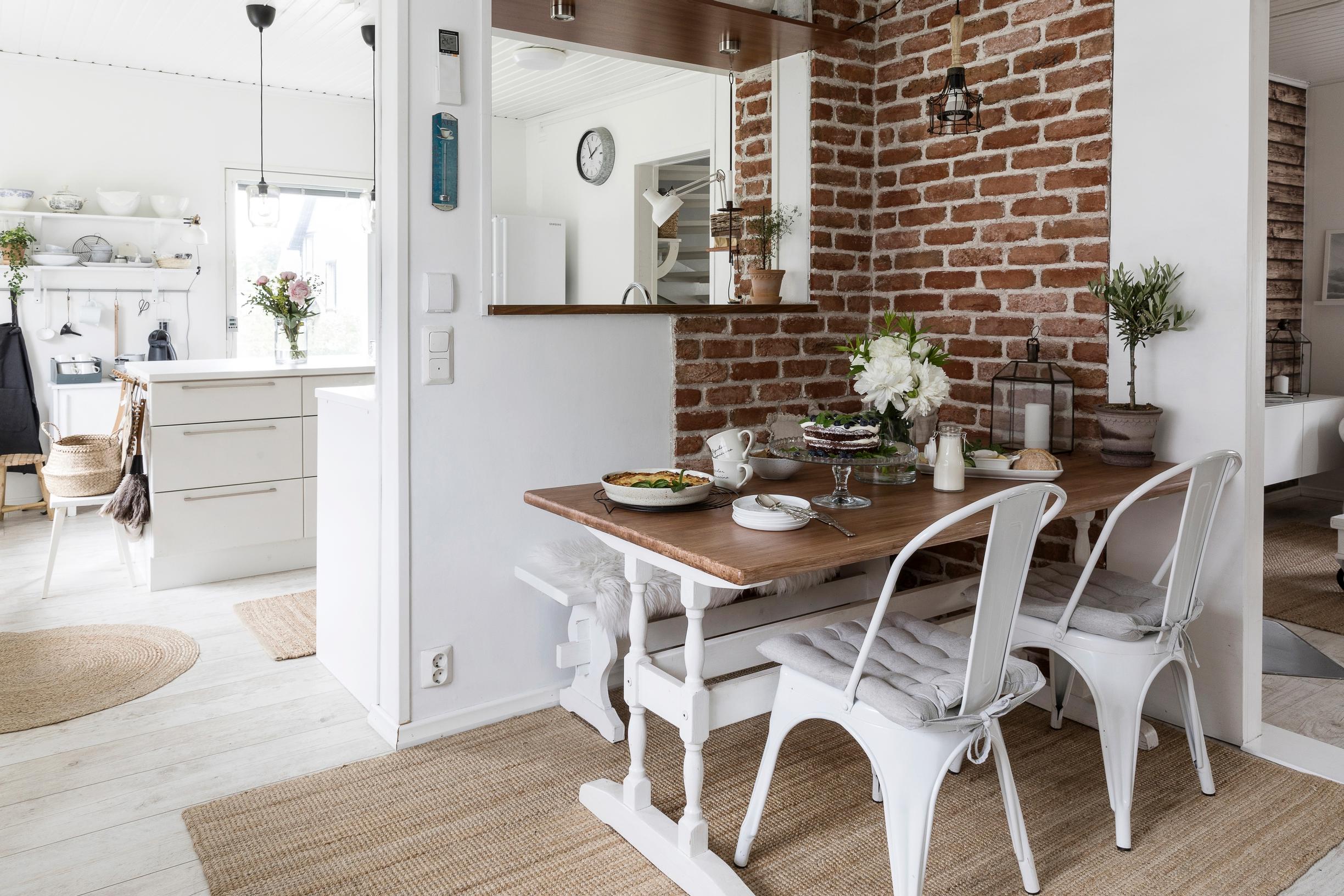 Remppailuistamme suosikkini on ehdottomasti keittiön aidon näköinen koristetiiliseinä. Siirsin ruokapöydän sen eteen – ja siinä sen paikka on. Katan pöydän kauniiksi, ja kokoonnumme koko perhe sen ääreen. Pieniä, meille tärkeitä juttuja.