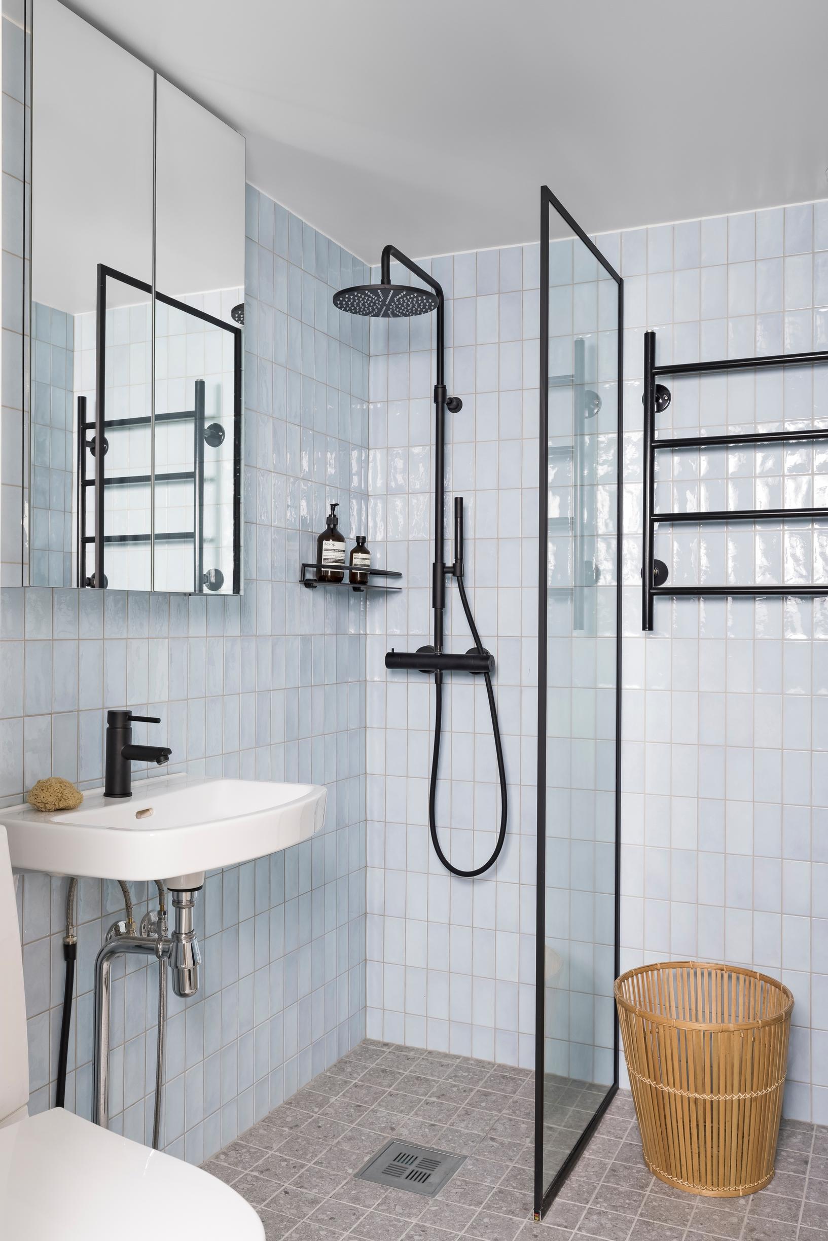 Kylpyhuoneen lattiaan valikoitui terrazzo-tyyppinen laatta talon rappukäytävän lattiamateriaalin inspiroimana. Pastellinen vaaleansininen seinälaatta tuo sille hyvän kontrastin ja myötäilee 1960-luvulla rakennetun asunnon muuta tyyliä. Mustat hanat ja yksityiskohdat tuovat kokonaisuuteen modernin aksentin.