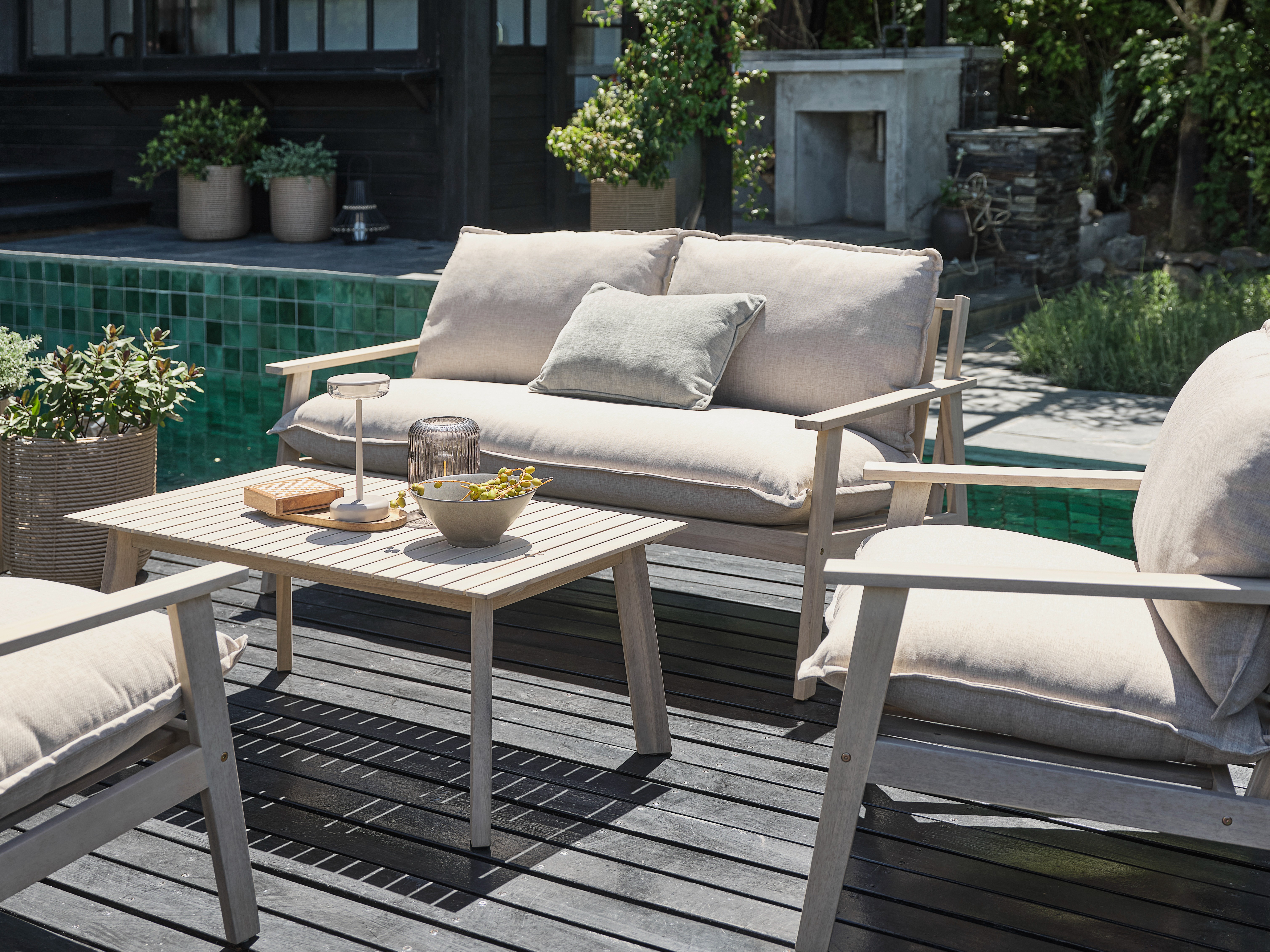 Jos kirkas puupinta on mieleesi, löydät runsaasti vaihtoehtoja: esimerkiksi FUGLSAND- ja KOLLEN-puutarhapöydät, RADSTED- ja TREBJERG-puutarhatuolit sekä SYLTHOLM-sohvaryhmä tuovat ulkotilaasi tyyliä ja mukavuutta modernilla ja rennolla otteella.
