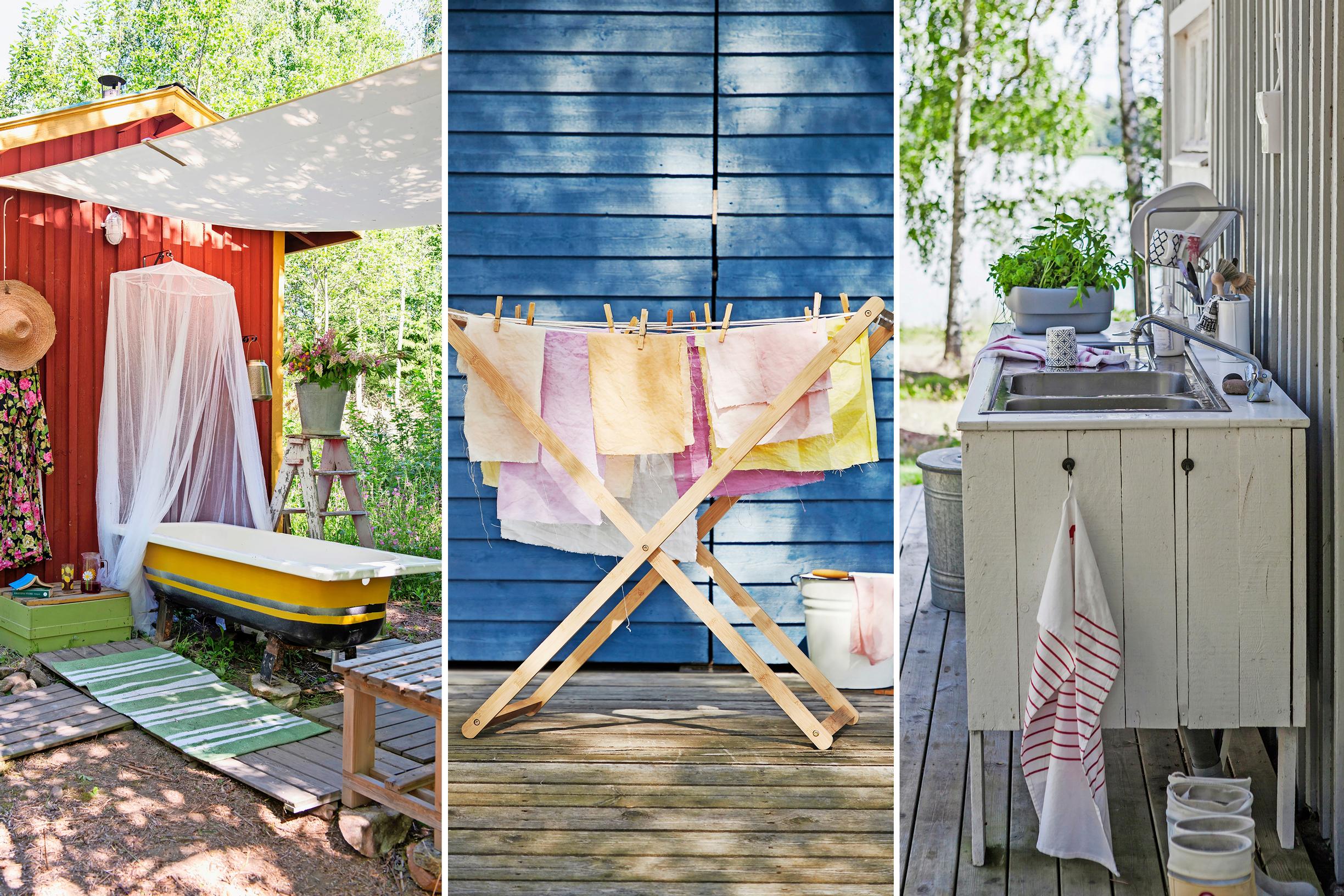 Kun tiskipaikka on toimiva ja näkymä kunnossa, tiskivuorot on helppo täyttää. Rakenna kesäkodin tiskipiste paikkaan, jonne saat johdettua veden sisältä. Vaihtoehtoisesti käytä kantovettä ja kerää harmaa vesi kastelua varten. Valitse rungoksi vanha, mutta vankka kaappi ja asenna allasosa ja tarvittavat putket. Pintojen kuluneisuus on vain plussaa, sillä ulos ei kaivata mitään kiiltävää tai liian fiiniä. Katso lisää kuvia hurmaavasta saarimökistä.
