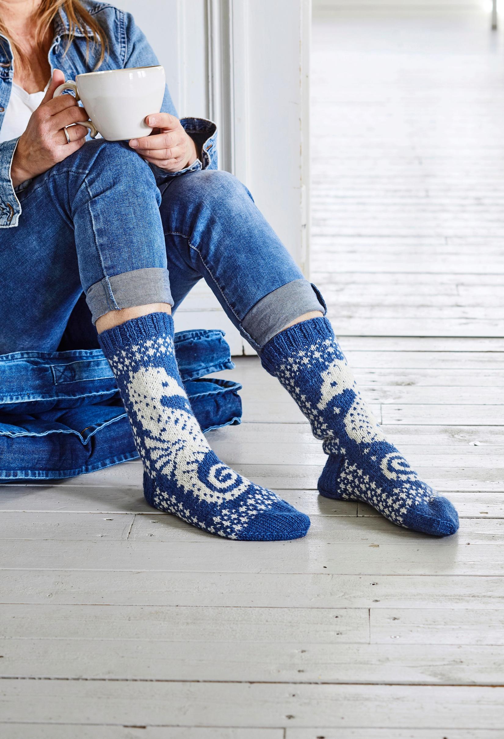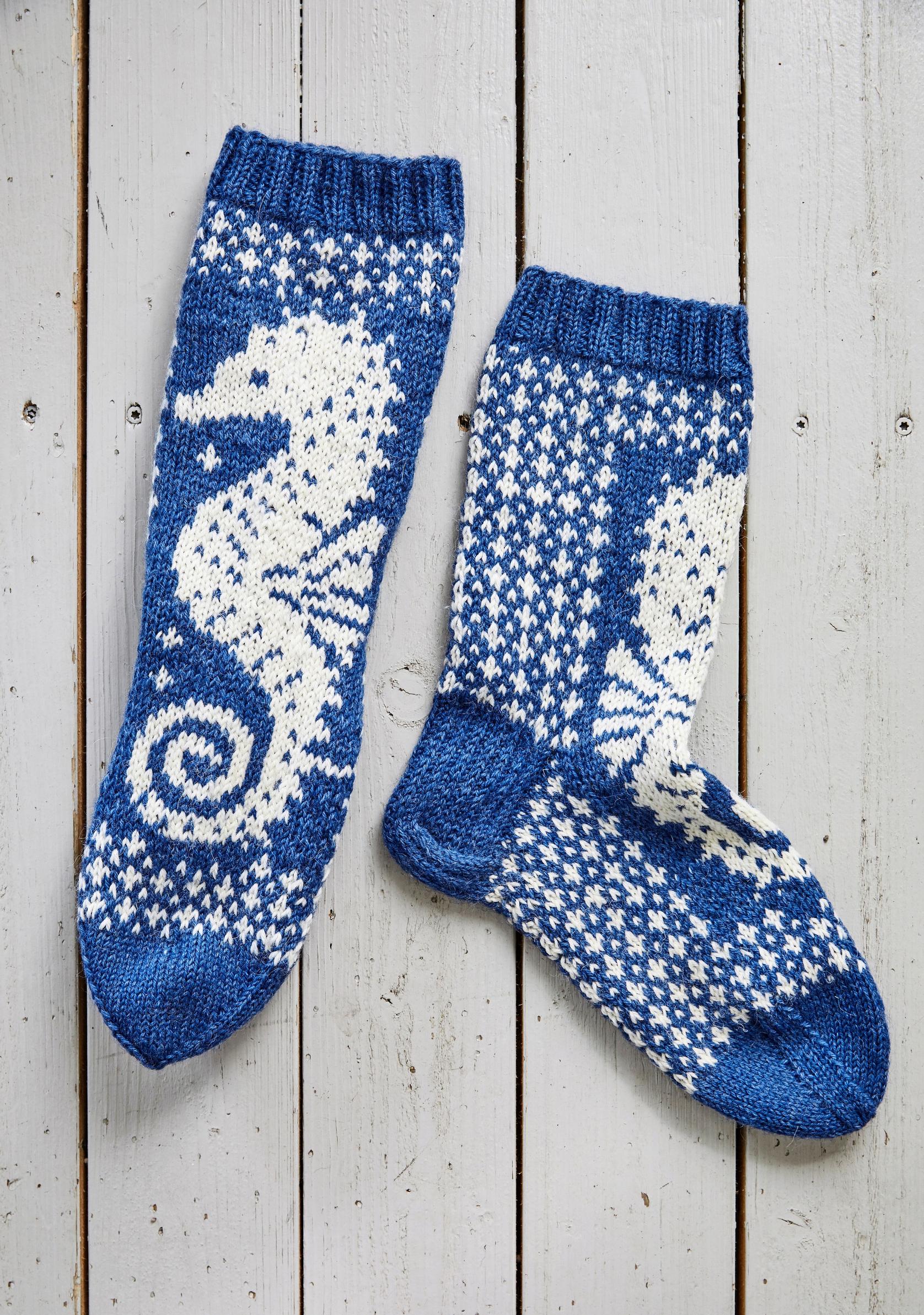 Kesäiset villasukat ihastuttavat merihevoskuviollaan – neulo klassisen sinivalkoiset sukat viluisten varpaiden iloksi