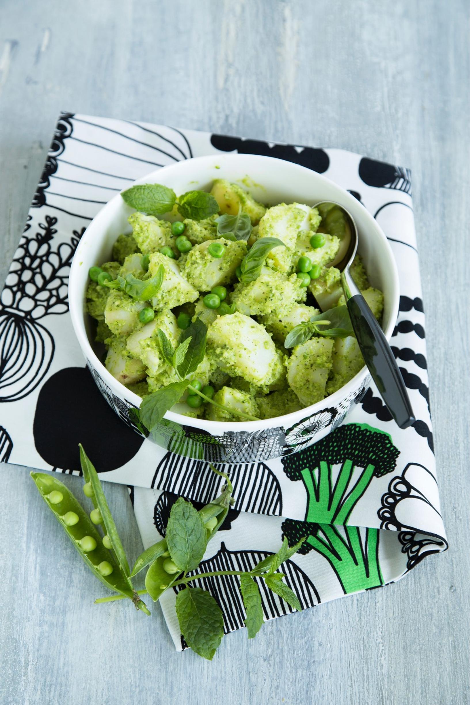 Vihreän perunasalaatin kastikkeena toimii raikas hernepesto, johon uppoaa herneiden lisäksi tuoreita yrttejä, parmesaania ja manteleita. Ihanan raikasta!