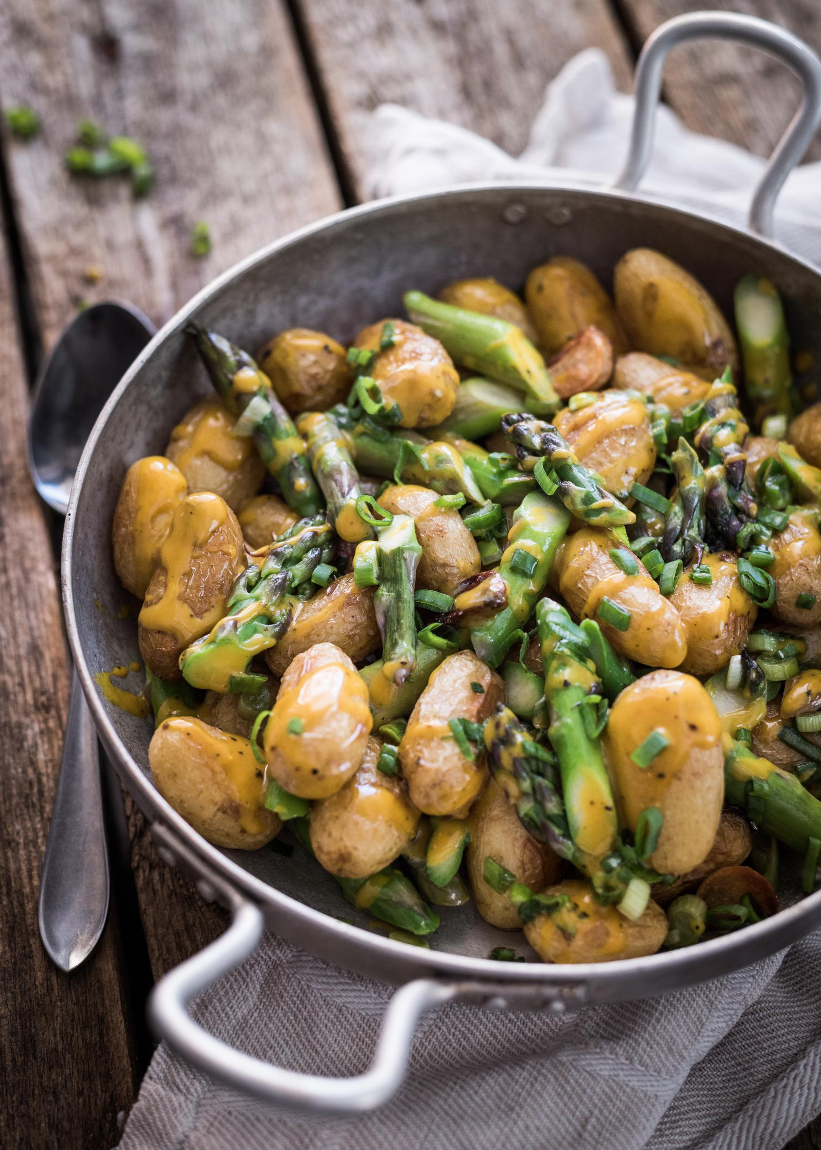"Todella hyvää" ja "Ehkä yksi parhaista keväisistä grilliruokien lisukkeista – nam!", kehuvat lukijamme paahdettua perunasalaattia. Salaatti kootaan yksinkertaisista aineksista: uunissa paahdetuista perunoista, parsasta ja sinappisesta kastikkeesta.
