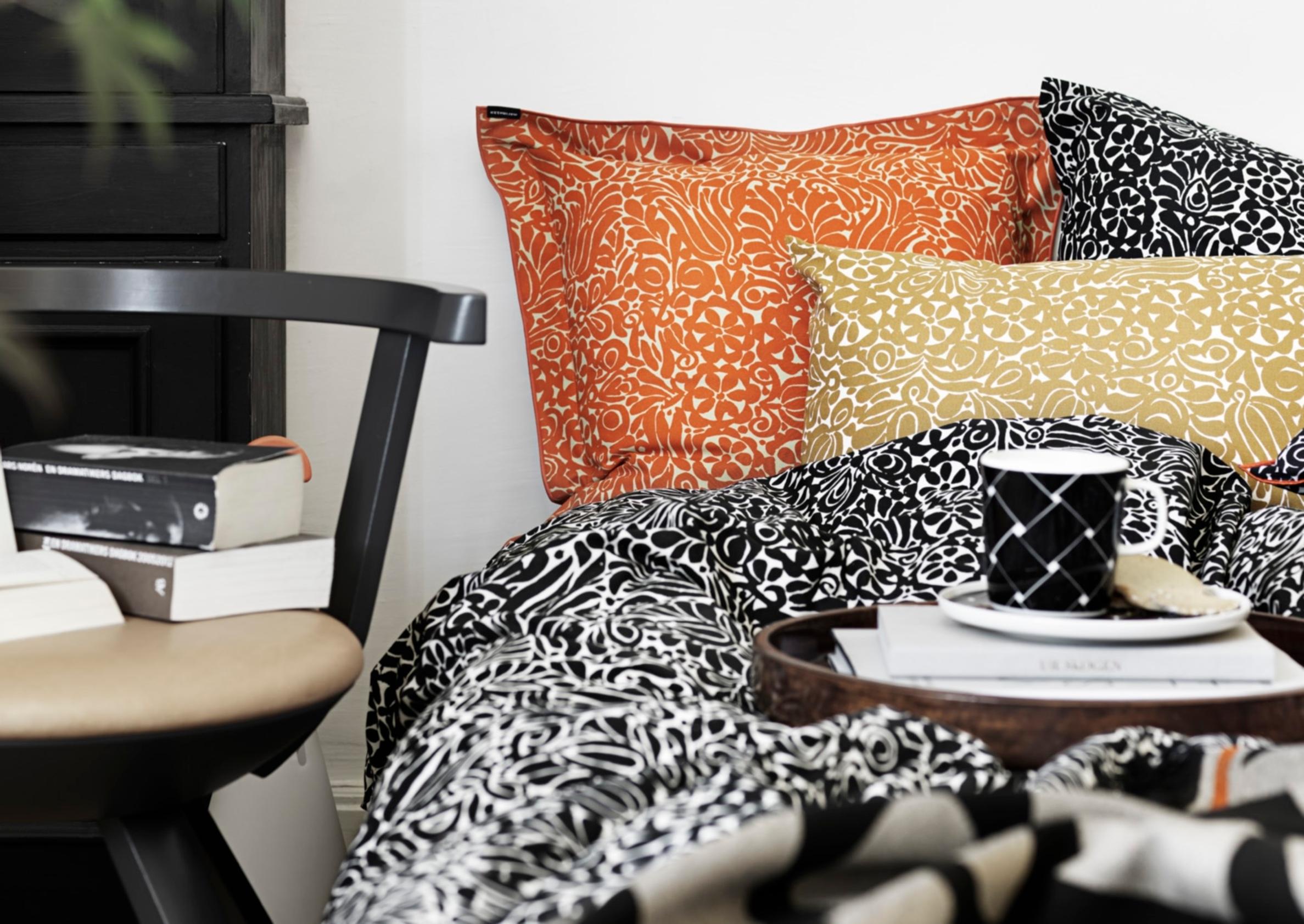 Kodin värit syvenevät. Marimekon kevätuutuuksissa näkyvät okran ja oranssin murretut sävyt. Linssi-viltti 155 €, Tamara-pellavapussilakana 59 € ja Tamara-pellavatyynyliina 9,90 €, Marimekko.