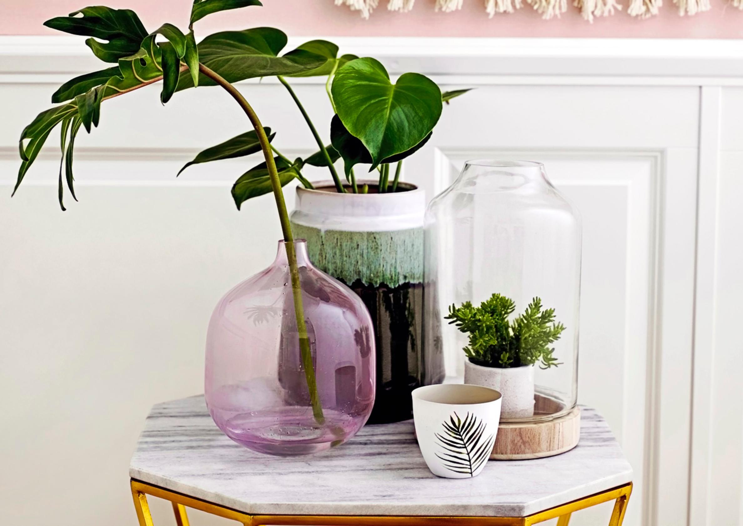 Käytä yksin tai kokoa näyttäväksi ryhmäksi. Kaunis ruukku tai maljakko nostaa kasvin sisustuksen katseenvangitsijaksi. Vaaleanpunainen lasimaljakko 31 €, Bloomingville.
