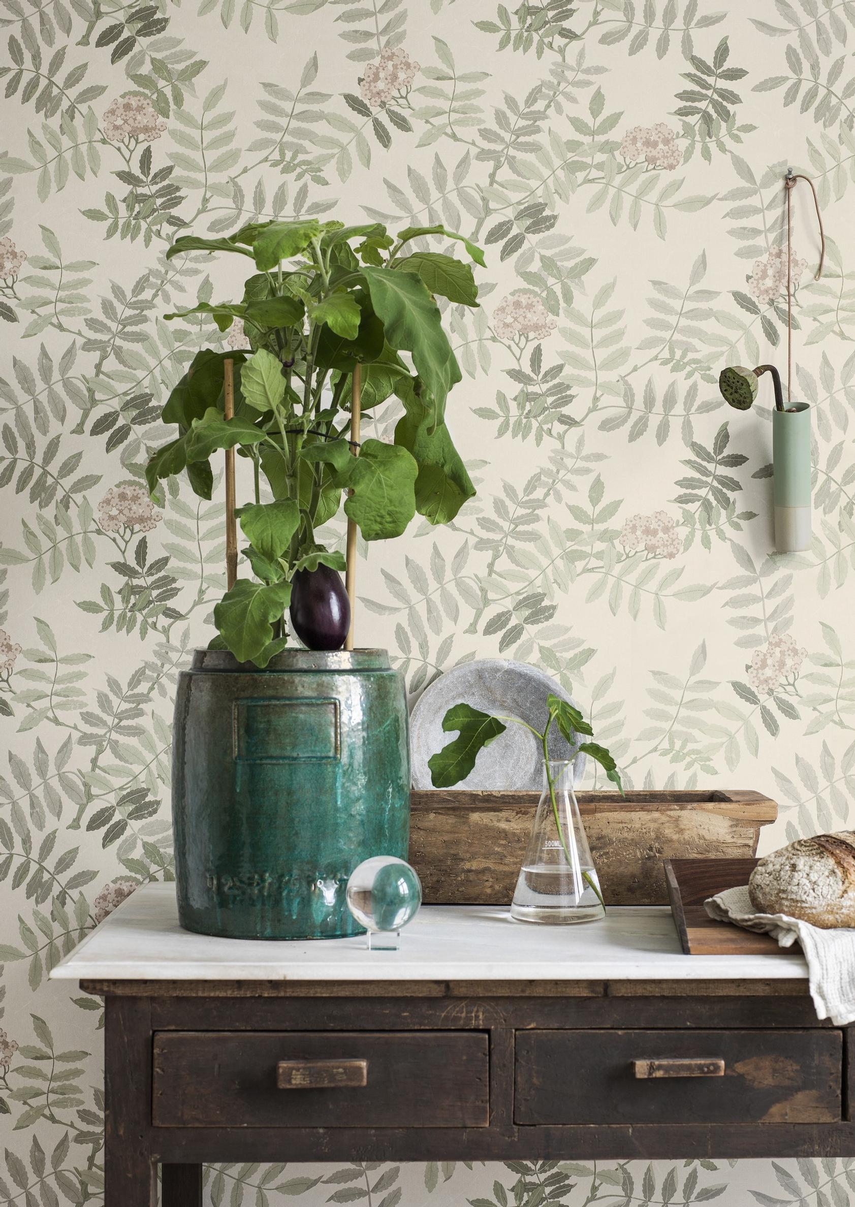 Kukkivaa pihlajaa kuvaava heleä kuosi on Boråstapeterin arkiston aarre vuodelta 1956. Soft Feelings Gentle -kuitutapetti 39 €/rll, Värisilmä.