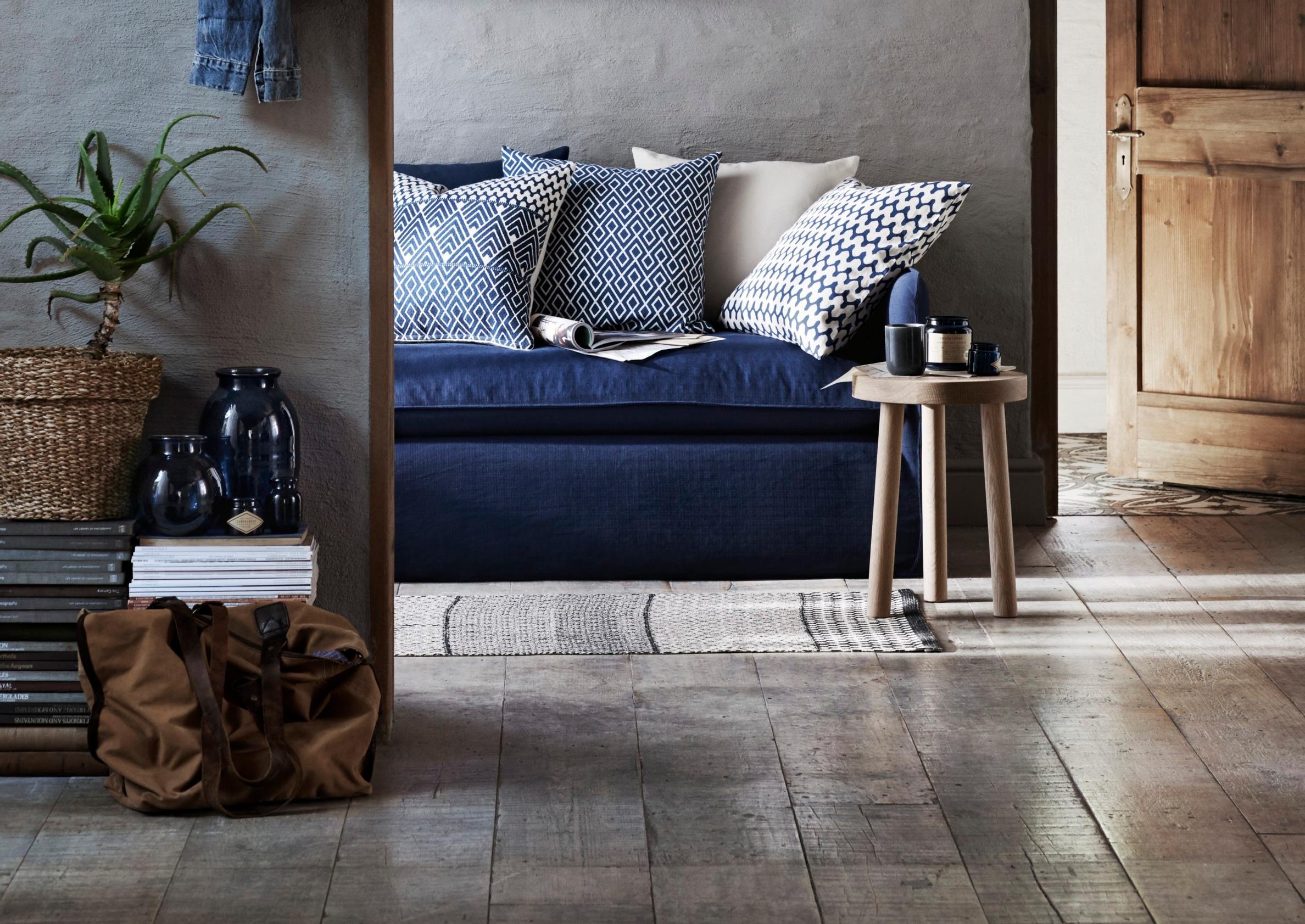 Puu ei ole koskaan pois muodista. Ajankohtainen sininen näyttää erityisen hyvältä patinoituneen puun seurassa ja tasoittaa liikaa rustiikkisuutta. Koristetyynyt ovat H&M Homen kevätmallistosta.