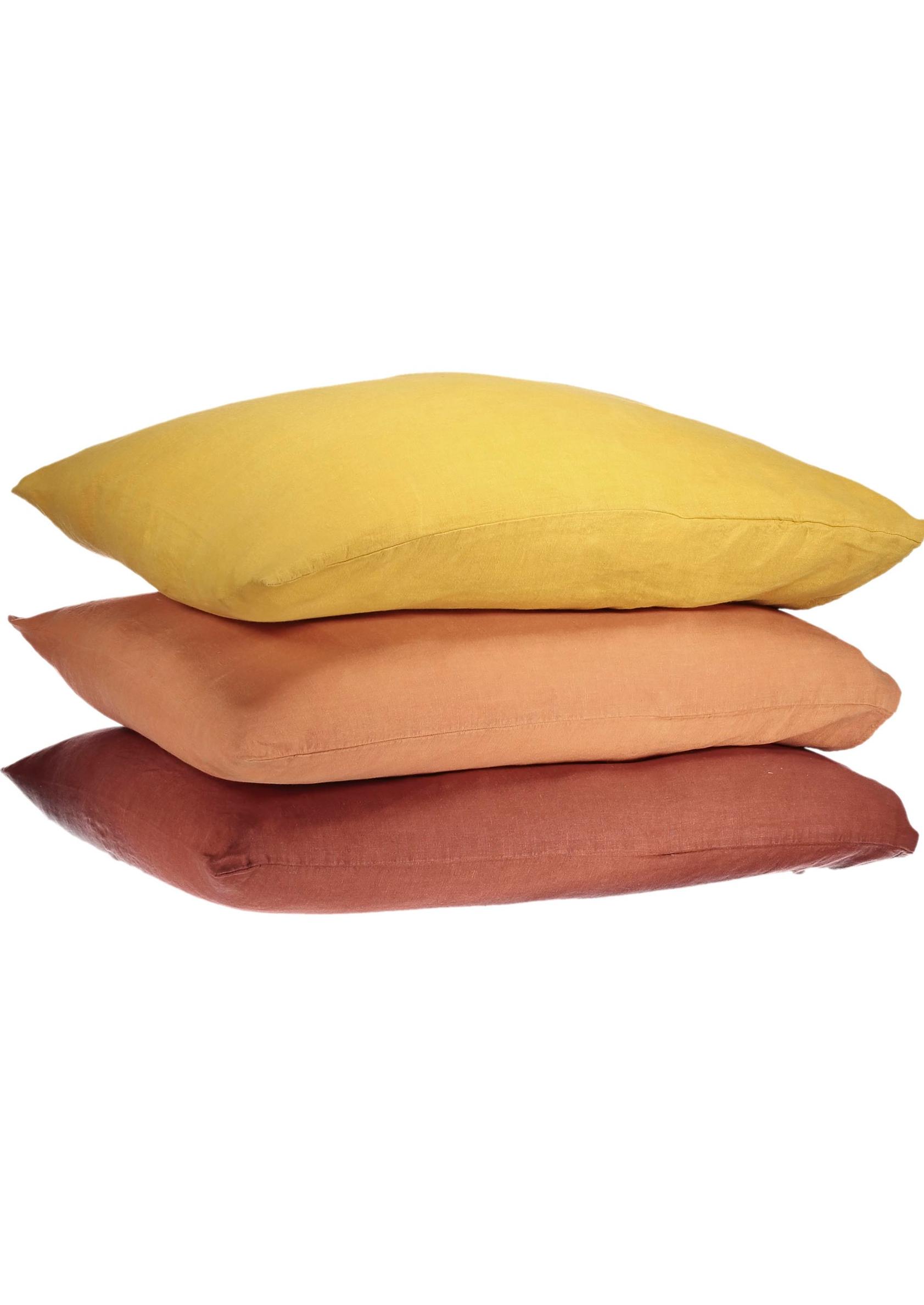 Pellavaiset tyynynpäälliset hehkuvat lämpimissä väreissä, alkaen 42 €, Balmuir.