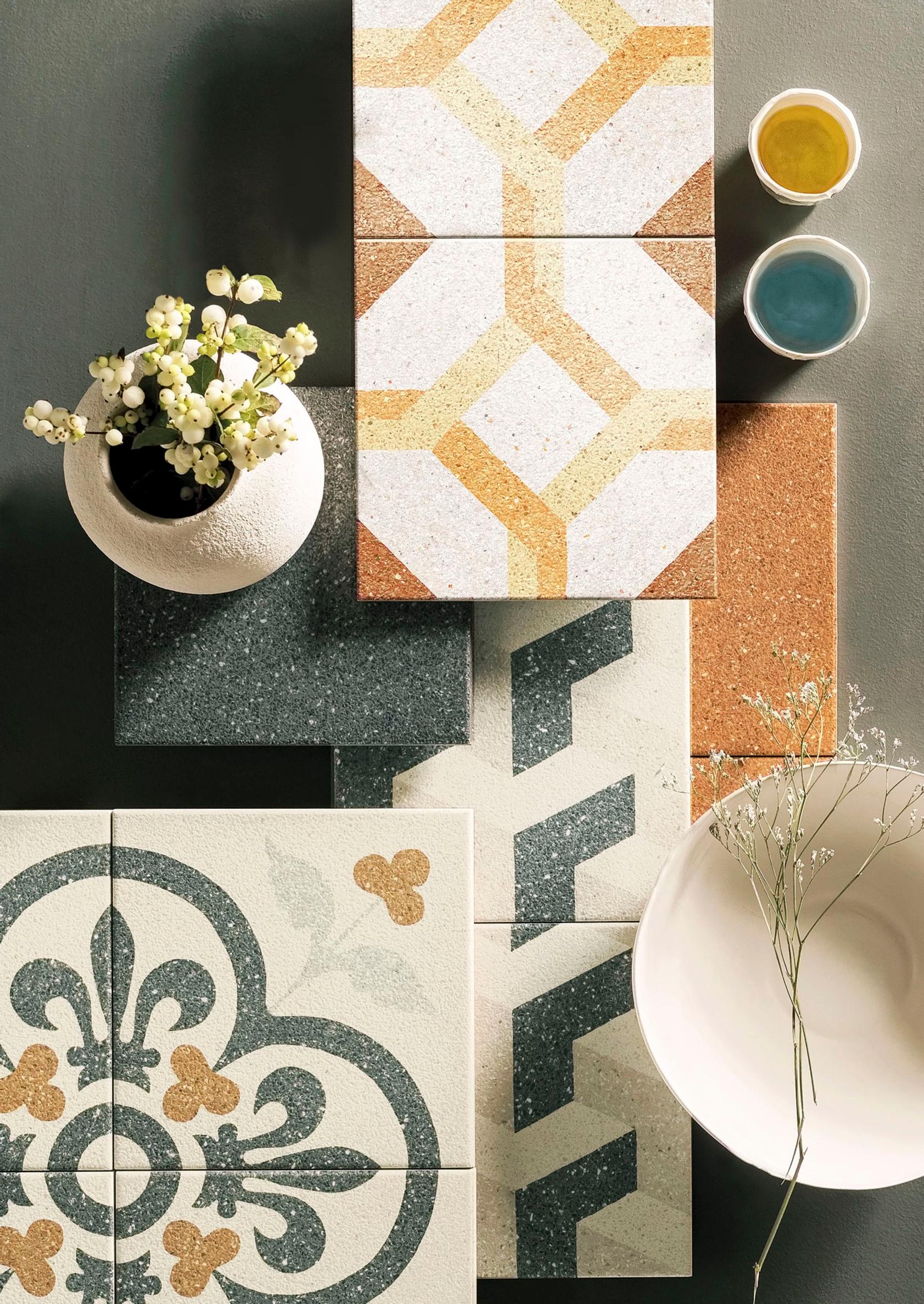 Mausteiset sävyt saavat lattian elämään. Forme-sarjan laatoissa (20 × 20 cm) on kaunis geometrinen kuviointi, 80 €/m² ja yksiväriset 69,95 €/m², ABL-laatat.