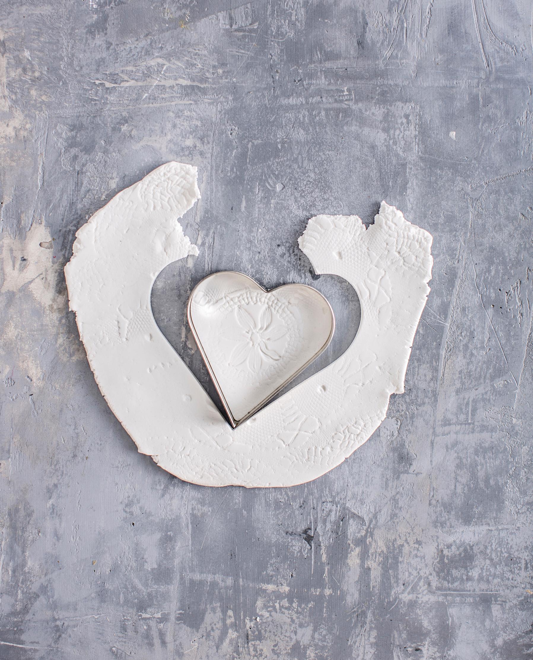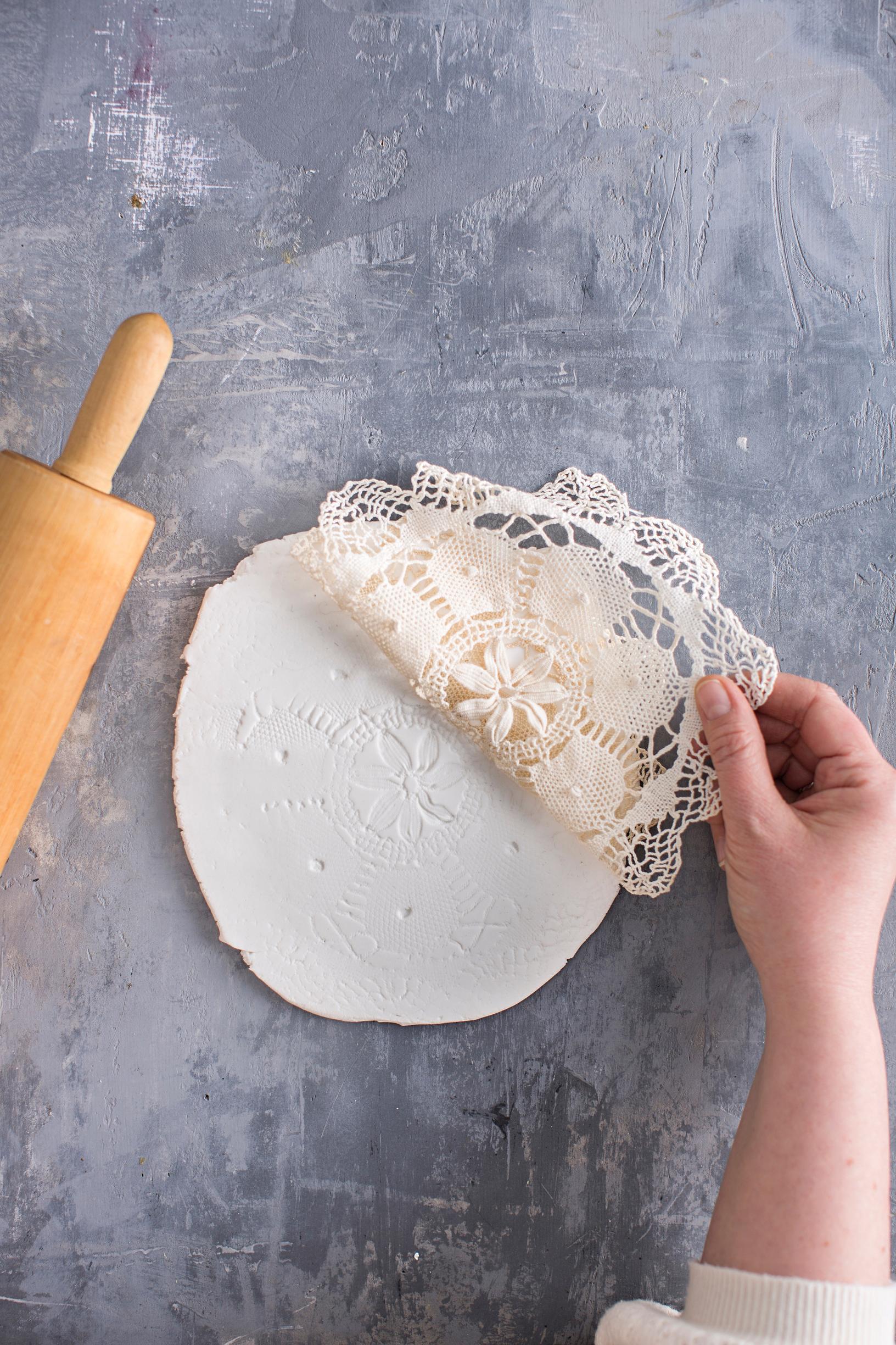 2. Aseta levyn päälle pitsiliina ja pyöräytä kaulin kerran sen yli, jolloin kuvio toistuu kuusenkoristeiden pintaan.