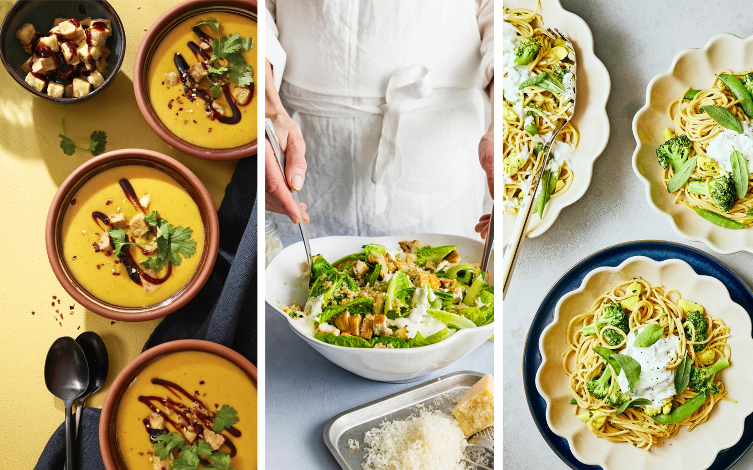 Kevyt ja täyttävä lounas – kevennä caesarsalaatti jogurtilla, lisää kuituja pinaattilettuihin ja tee kanapasta ilman kermaa
