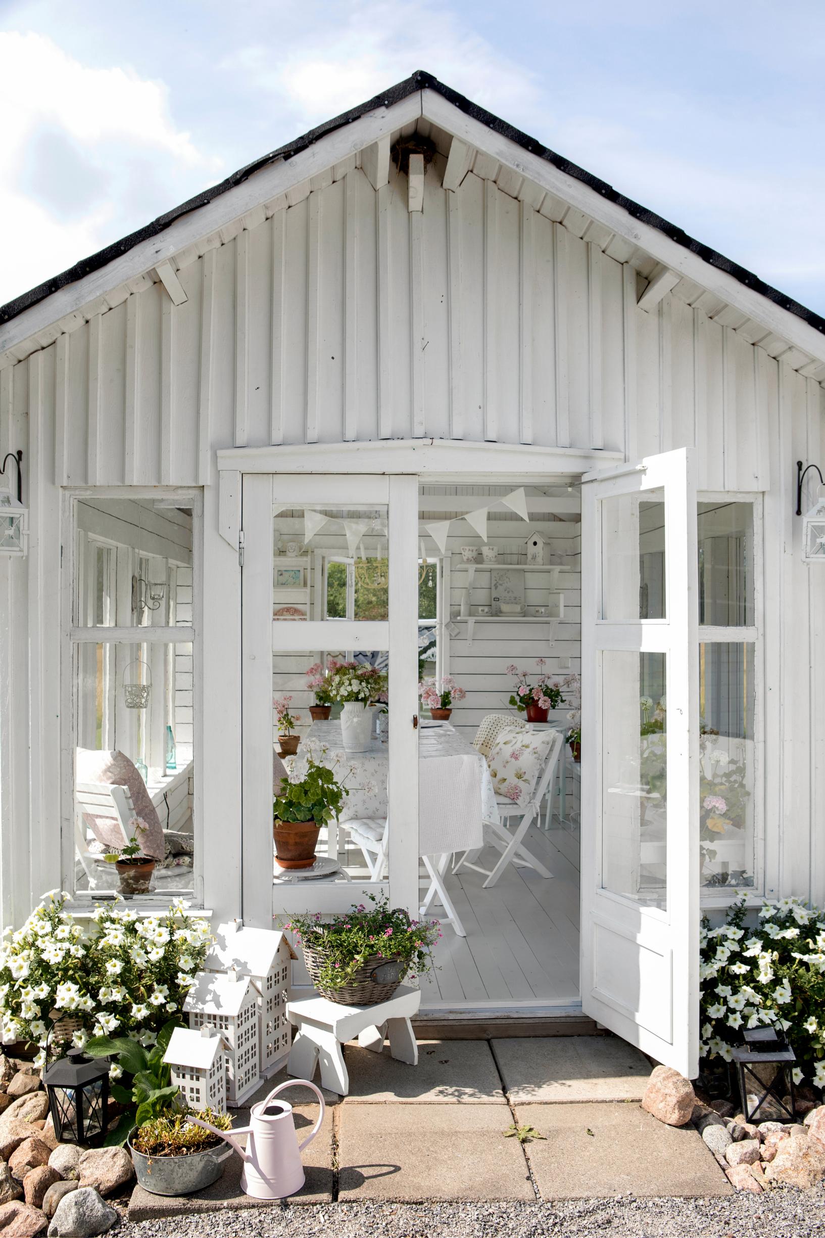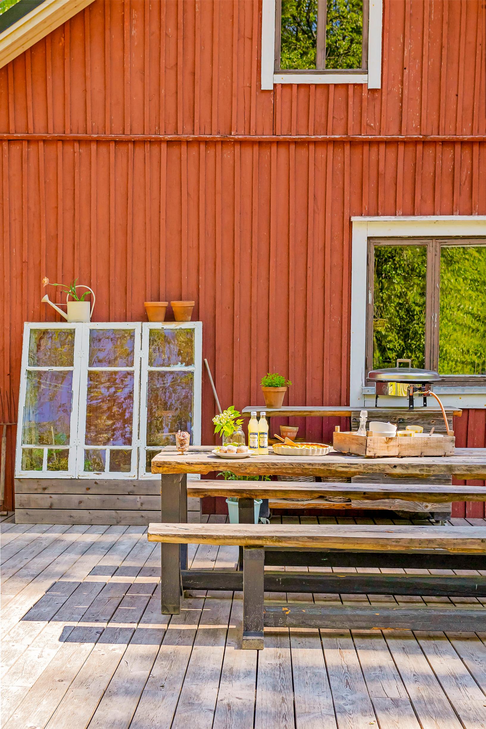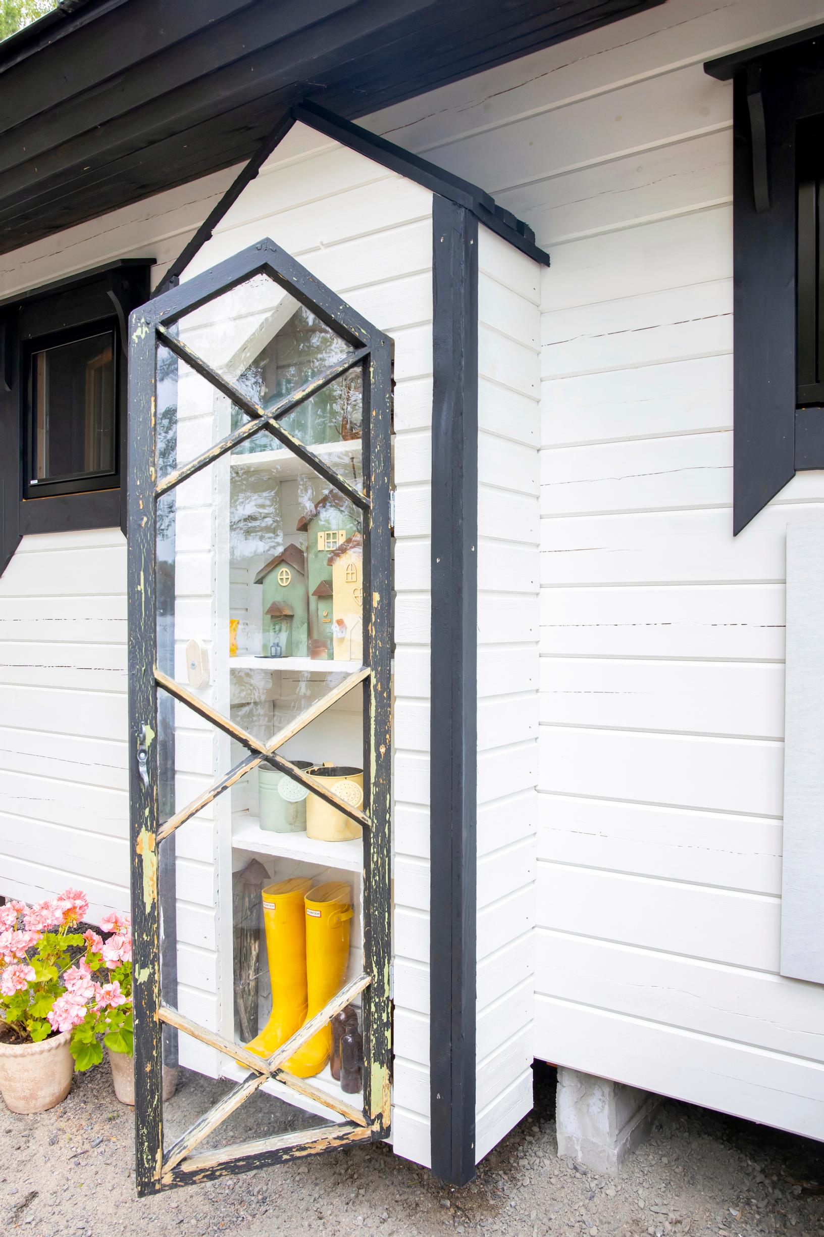 Räystään alle sateelta suojaan on nikkaroitu puutarhatarvikkeille kaappi, jonka oveksi on kiinnitetty aiemmin vain koristekäytössä ollut ikkuna. Näin ovea avaamatta näkee, mitä kaapin hyllyille on nostettu.
