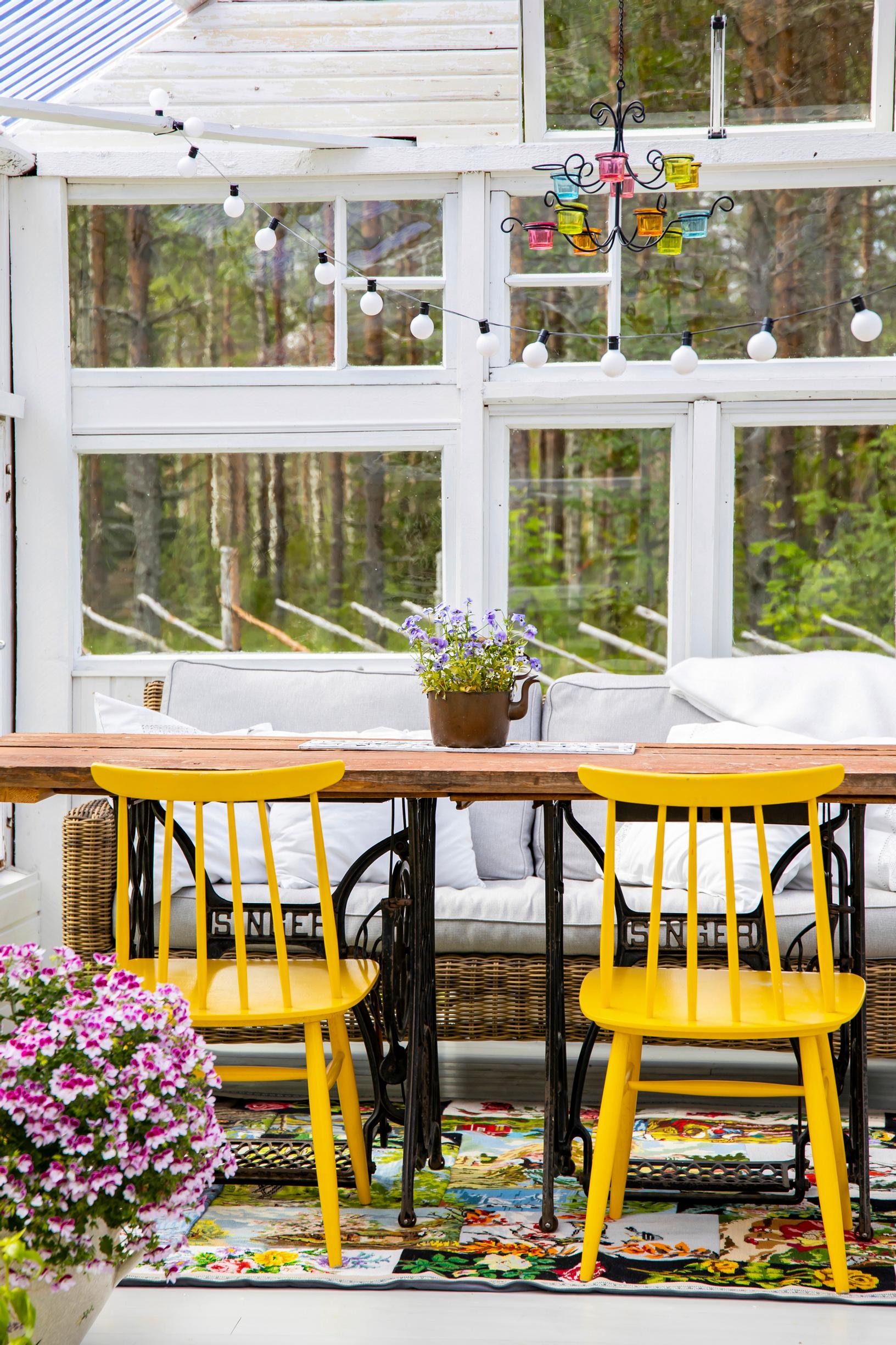 Kesäisen keltainen vitriinikaappi on tehty vanhan talon ikkunoista ja trukkilavan lavakauluksesta. Veikeät tee itse -ideat syntyvät usein kierrätysesineistä, joiden käyttötarkoitus muuttuu mutta ilme säilyy. Parolan asema -blogin Katja Rinkisen ohjeella teet itse vanhoista ikkunoista vitriinikaapin: meko.fi/vitriini-ikkunoista.