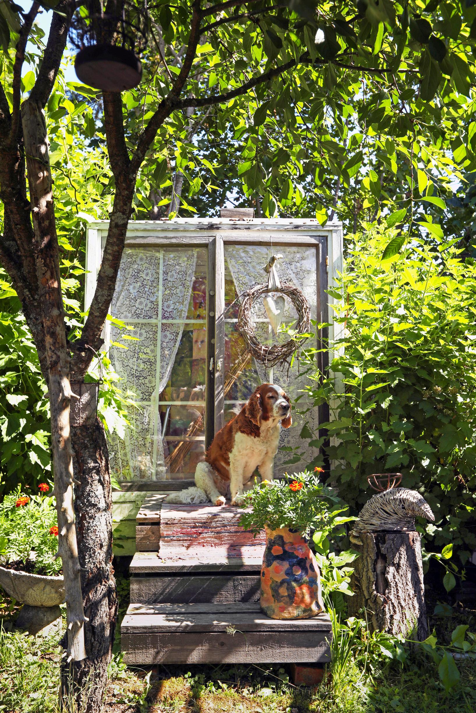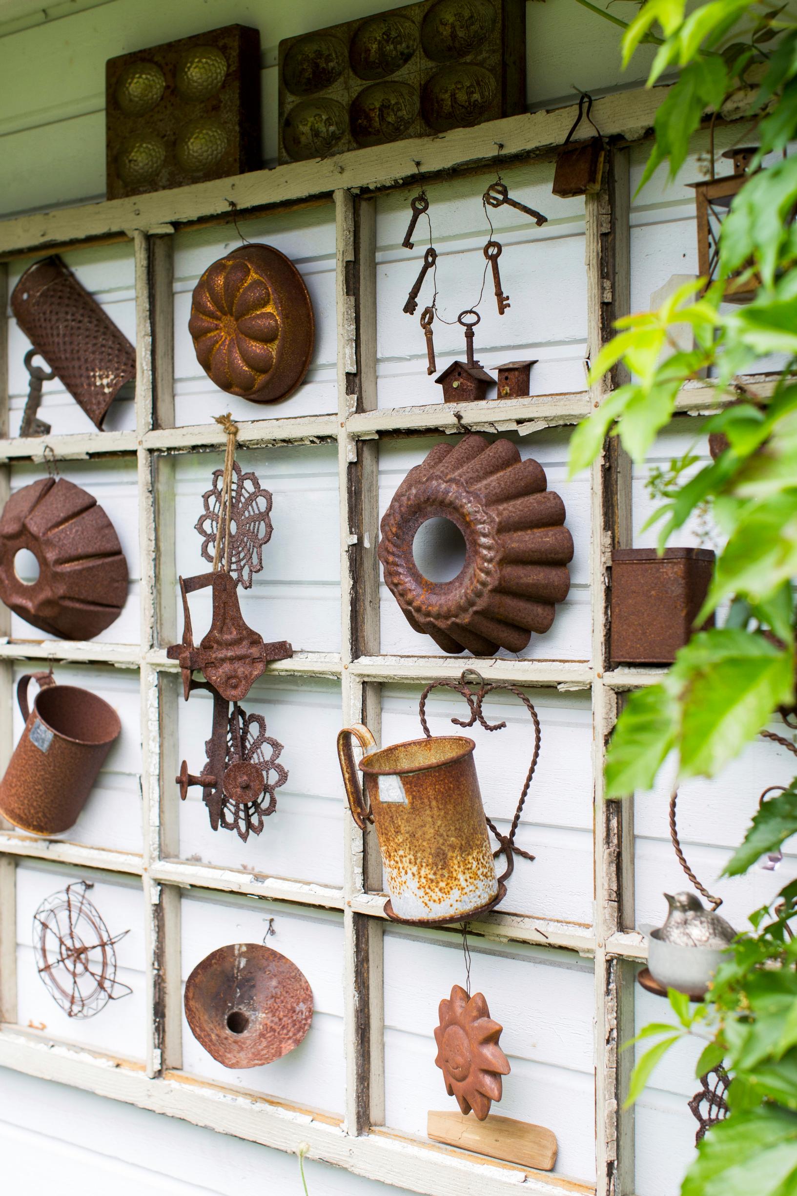 Yllättävät yksityiskohdat ilahduttavat myös puutarhassa. Liiterin seinälle on nostettu vanha ikkunankehys, jossa ei ole enää laseja. Jokaiseen ruutuun on kiinnitetty ajan patinaa pintaansa saanut kirppislöytö. Jos esineessä ei ole tarpeeksi ruostetta omasta takaa, sitä on lisätty ruostemaalilla.