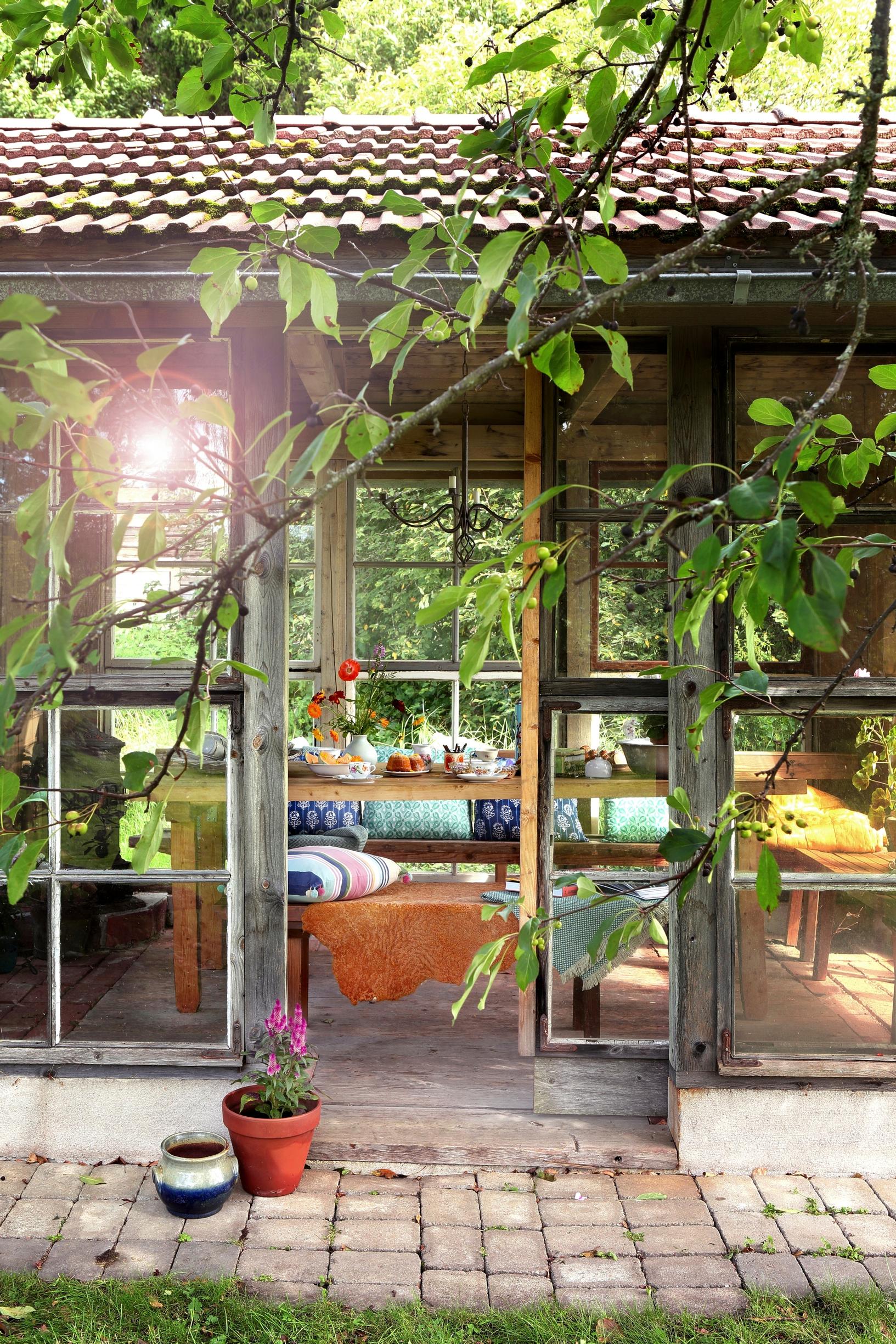 Perinteikkään talon pihapiirin perälle on pystytetty pieni lasimaja, joka toimii välillä leikkimökkinä, välillä säilytyspaikkana. Tunnelma on mielikuvitusta herättävän kiehtova.
