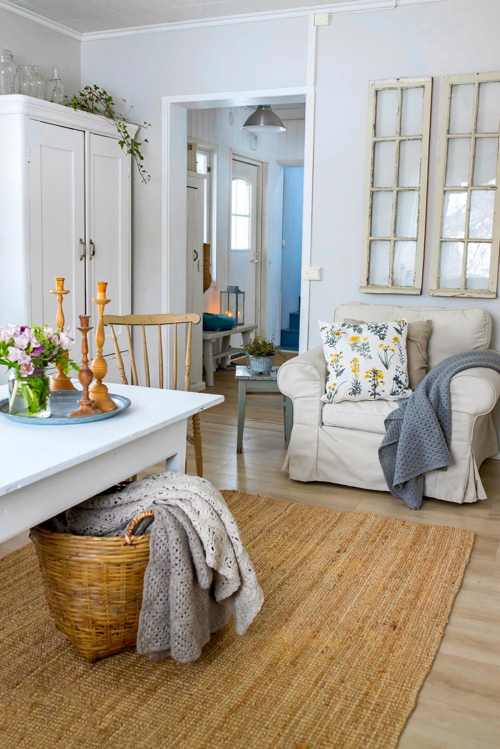 Seinälle kiinnitetyt ikkunanpuitteet muodostavat kauniin sisustuksellisen elementin, lasiruuduilla tai ilman. Halutetessaan ikkunoiden taakse voi kiinnittää esimerkiksi mökkimaisemaa esittävän kuvan.