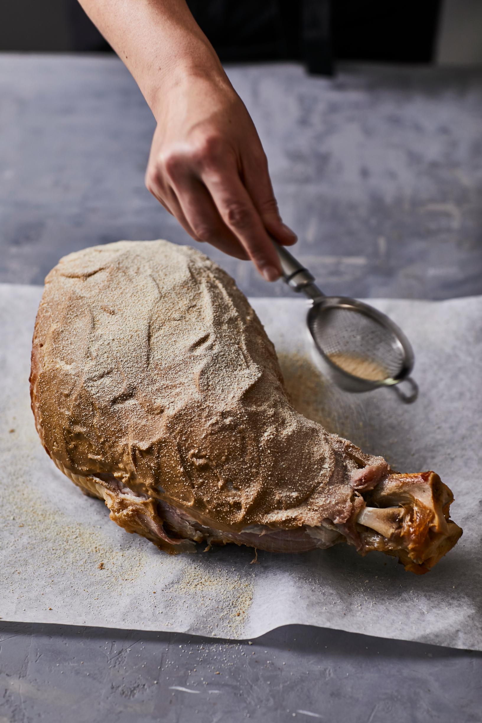 2. Siivilöi kinkun pinnalle puoli desiä korppujauhoja.