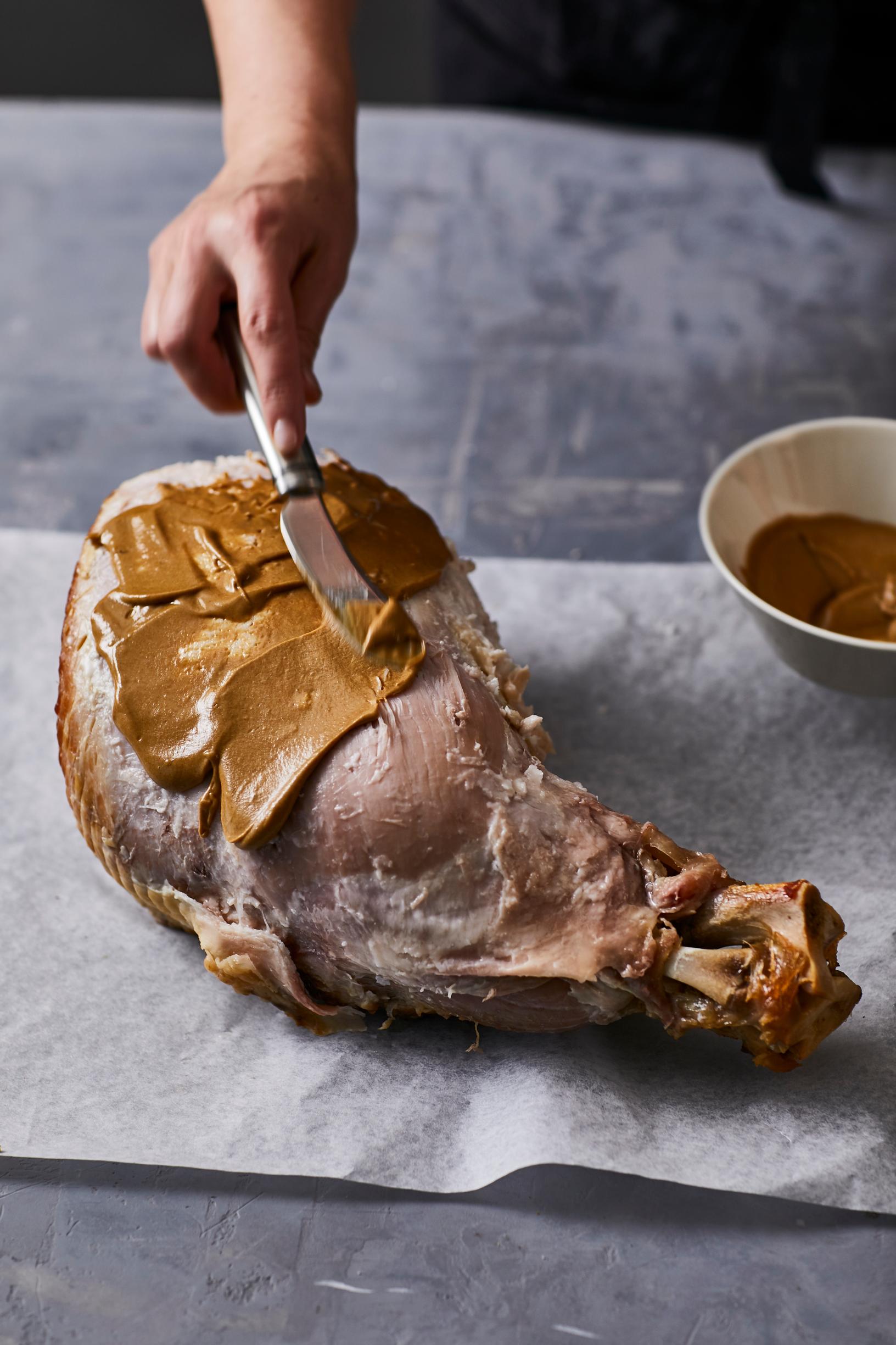 1. Sekoita 1 keltuainen, 1 rkl perunajauhoja ja 1 dl väkevää sinappia. Sivele kinkun pinta seoksella.