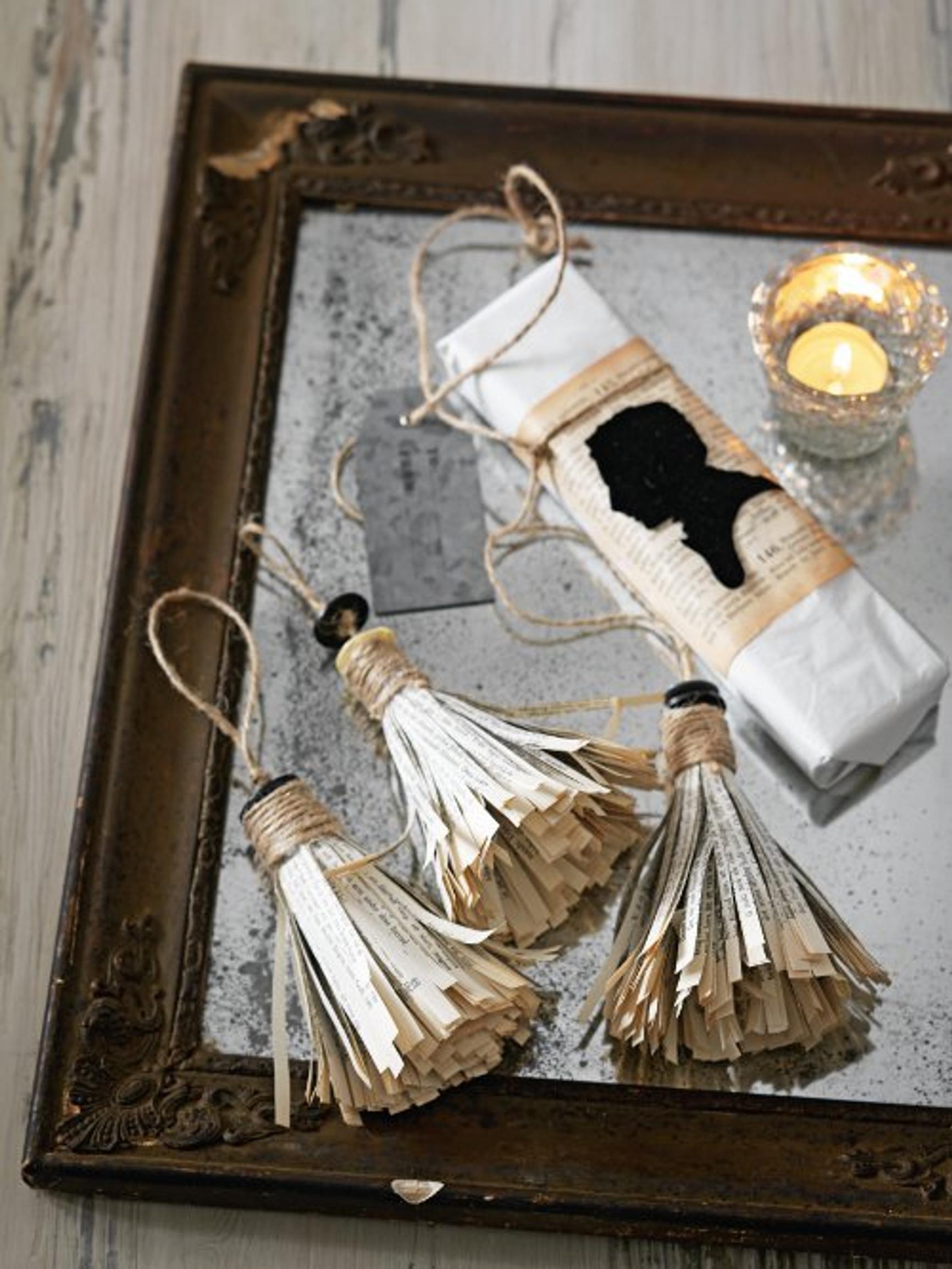 Tupsukoriste valmistuu kellastuneista sivuista, napeista ja juuttinarusta. Itse tehdyssä siluettikoristeessa on sopiva annos herrainsalongin tunnelmaa.