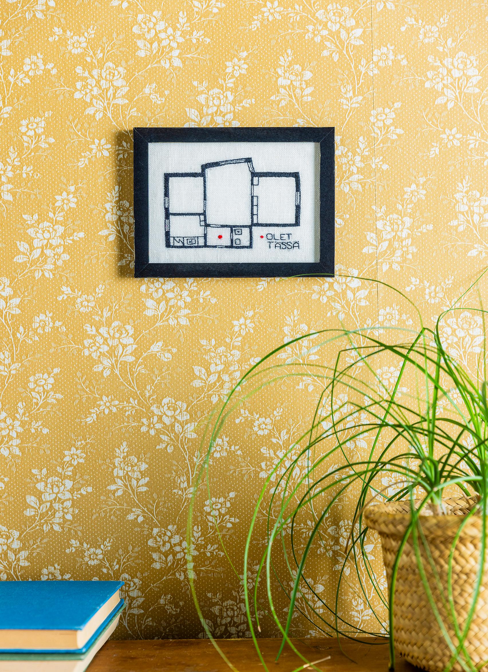 Kankaaseen kirjottu pohjapiirros on kodin persoonallisin taulu! Kun viimeistelet taulun merkkaamalla sen sijainnin punaisella pallolla, saat hupaisan opaskartan. Kirjontatyö on hyvä idea vaikka tupaantuliaislahjaksi.