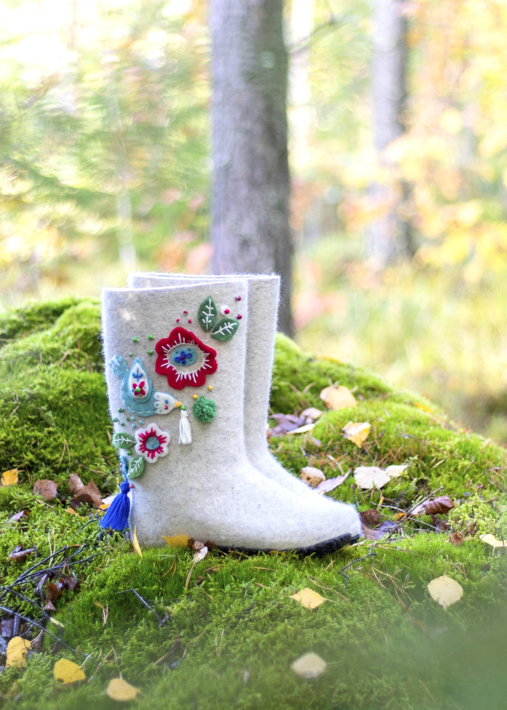 Tavalliset huopikkaat muuttuvat taideteoksiksi huopakuvioilla ja kirjontapistoilla. Kuviot saivat inspiraationsa perinteisistä saduista ja kansanomaisista käsitöistä.