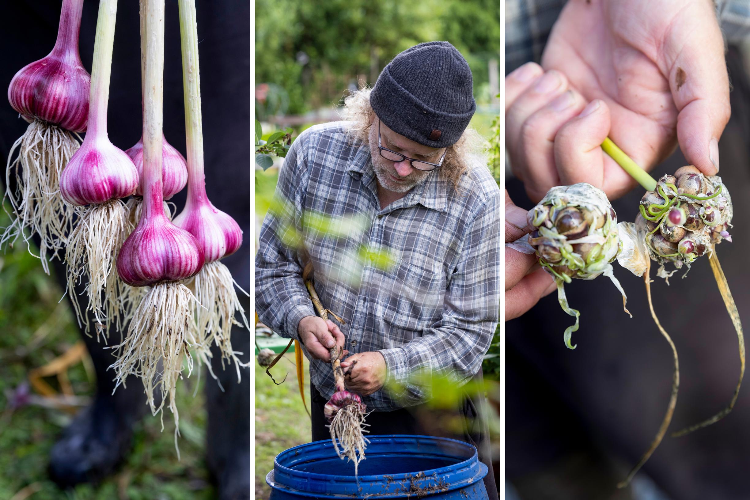 Kotoutuksen jälkeen myös ’Havran’ on menestynyt hyvin. Torsten silittää hellästi kynsilaukan alta esiin pursuavaa muhkeaa juuristoa. Sellaisia ei näe ruokamarkettien valkosipulihyllyillä. Jos sadonkorjuu tehdään koneellisesti, laukkoihin tulee helposti kolhuja.