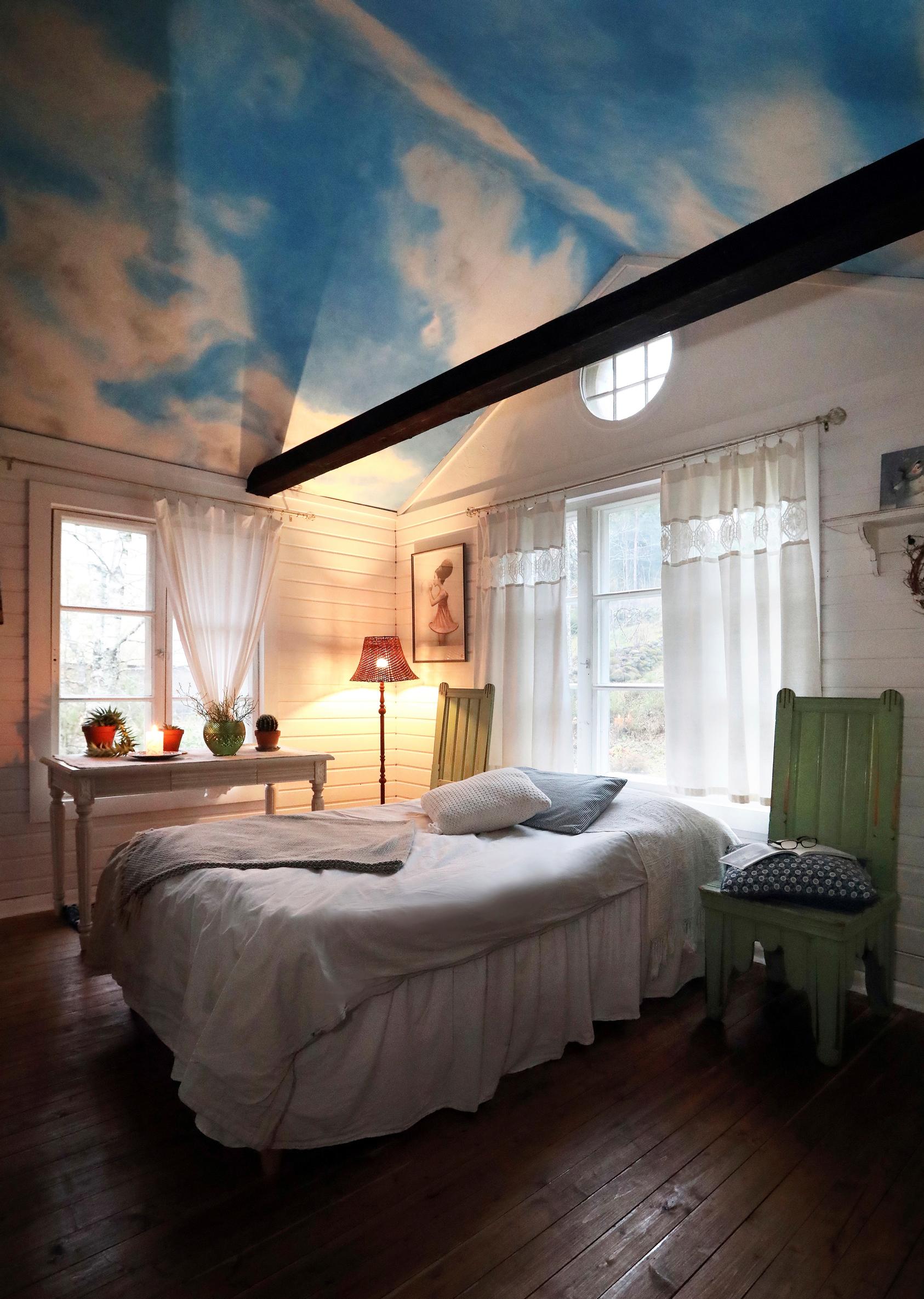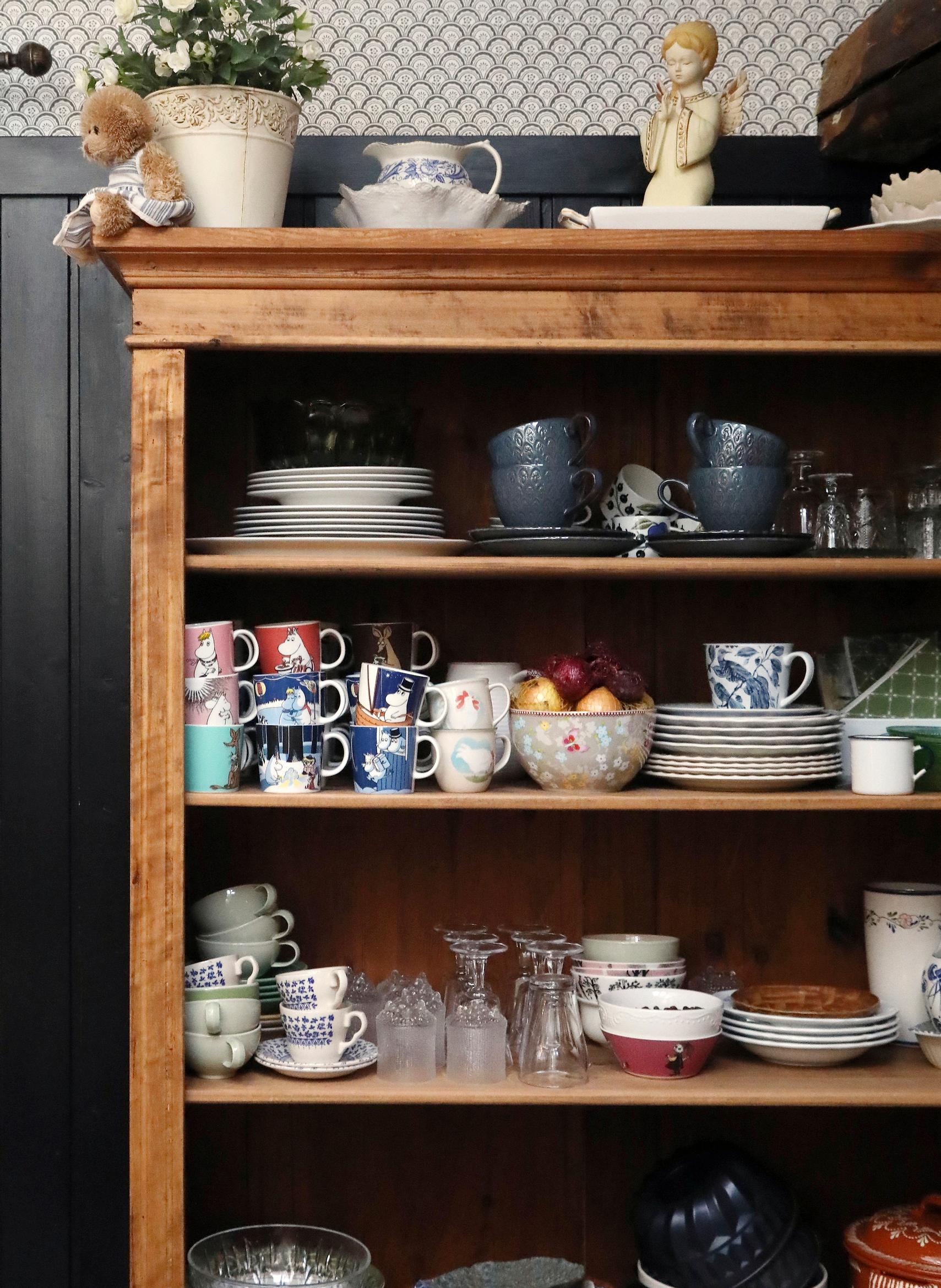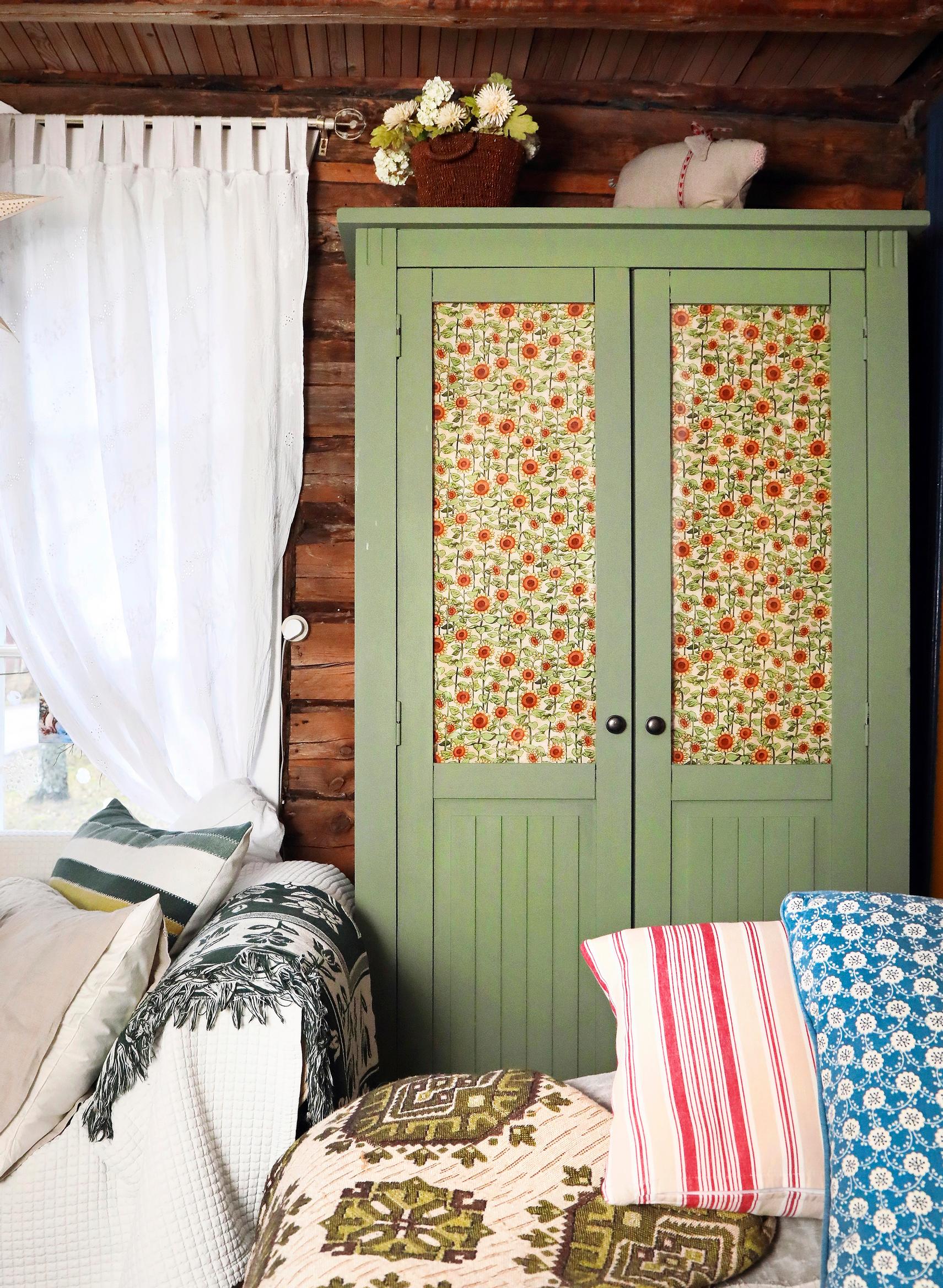 Suureksi osaksi kirppislöydöillä. Käytän vähän rahaa ja paljon kekseliäisyyttä. Tykkään maalata ja tuunata huonekaluja. Kodissa pitää olla huumoria ja jopa lapsenmielisyyttä. Ostin kirpparilta söpöt lastentuolit, koska ne olivat kuin suoraan Kultakutri-sadusta. Olen ihastunut vihreän sävyihin, ne tuntuvat sopivan talon henkeen. Kun haluan vaihtelua, vaihdan tyynyt ja peitot. Se on helppo ja halpa tapa saada kotiin uutta ilmettä.