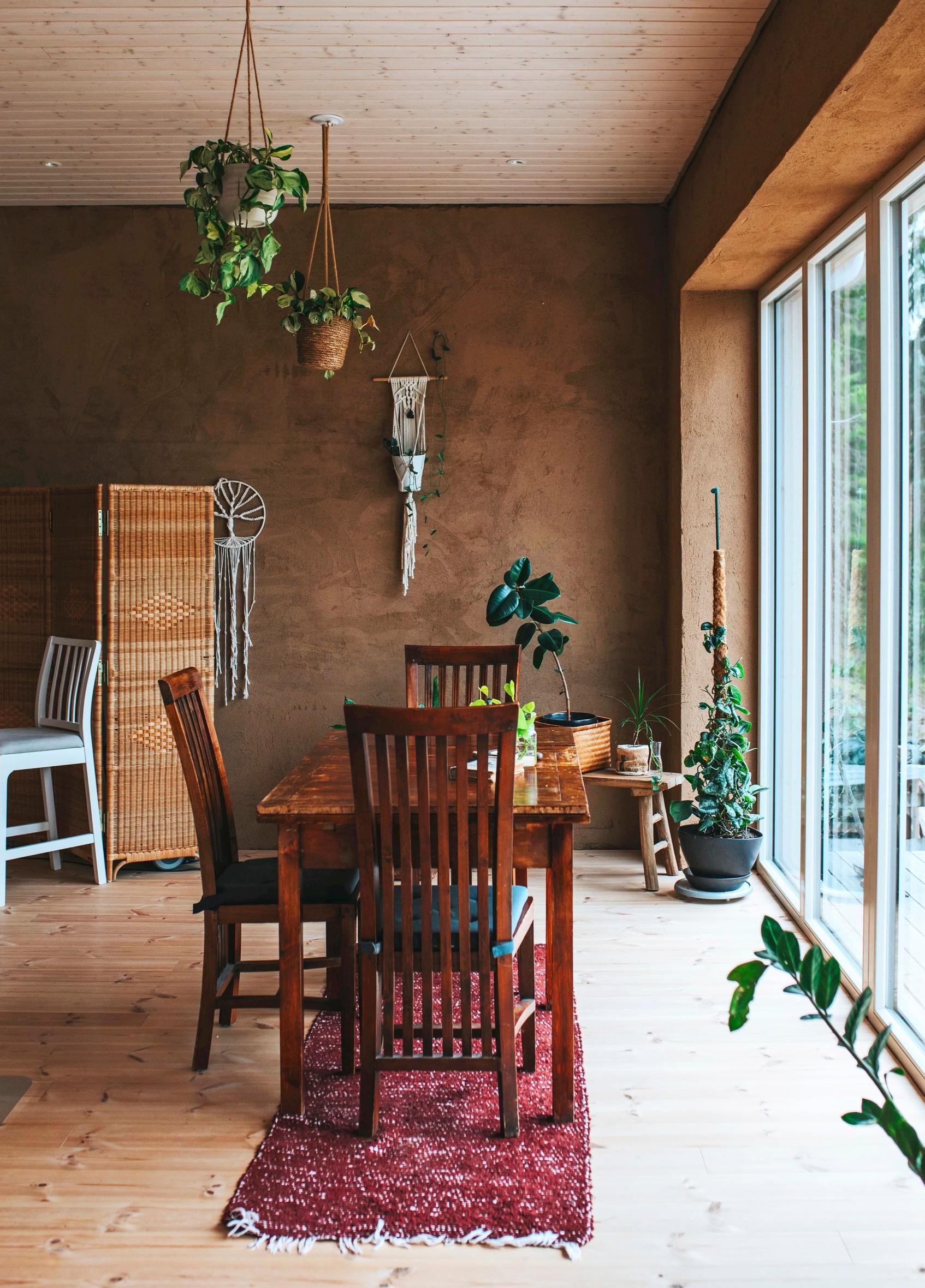 Vahvin sisustuksellinen vaikutus syntyy seinistä. Ne hehkuvat maanläheisessä lämpimänruskeassa sävyssä. Luonnollisuus on sananmukaista, sillä seinät on rakennettu liettualaisen EcoCoconin valmistamista olkielementeistä, joissa ei ole käytetty liimaa ja muovia. Rappaus on tehty savesta. Epätasaisesti levitetty rappaus houkuttelee sivelemään seinää sormin.