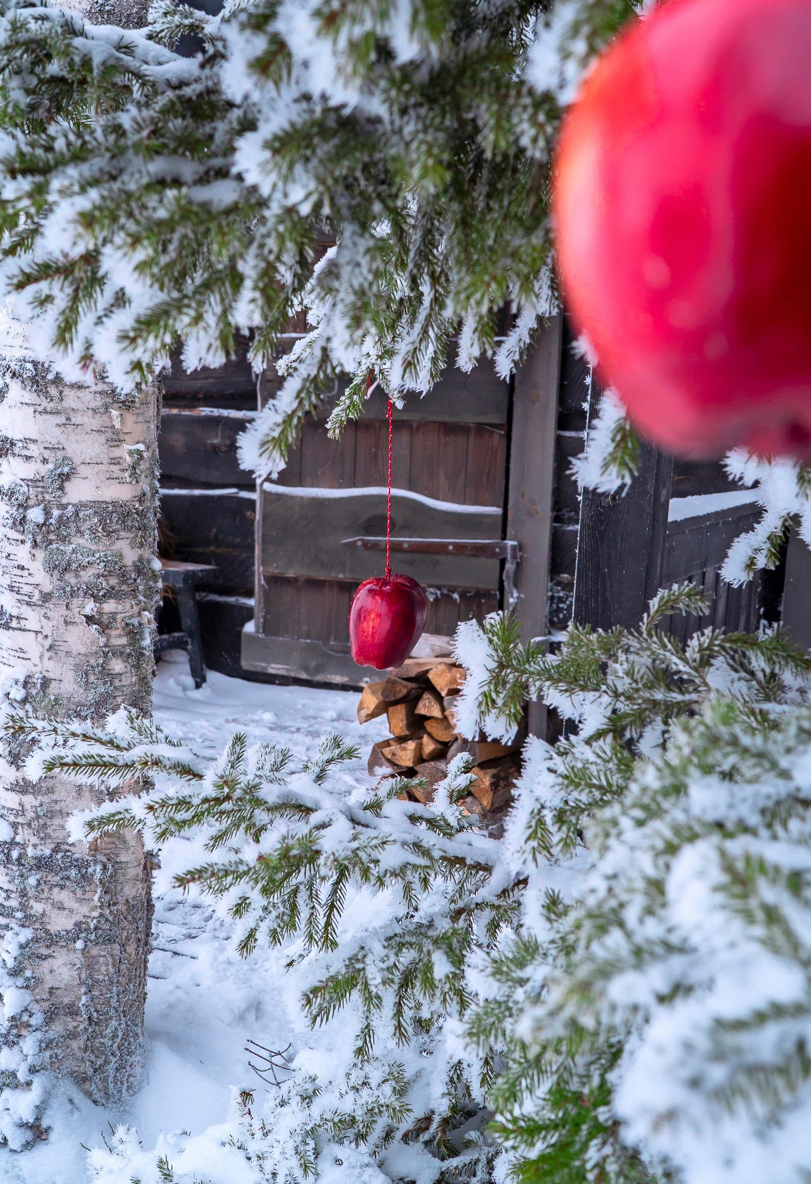 Tiina ja Kari levittelevät havupeitteen savusaunan portaiden eteen, minkä jälkeen punaposkiset omenat nostellaan koko perheen voimin kuusen oksille keikkumaan. On aika laskeutua mökkijoulun rauhaan.