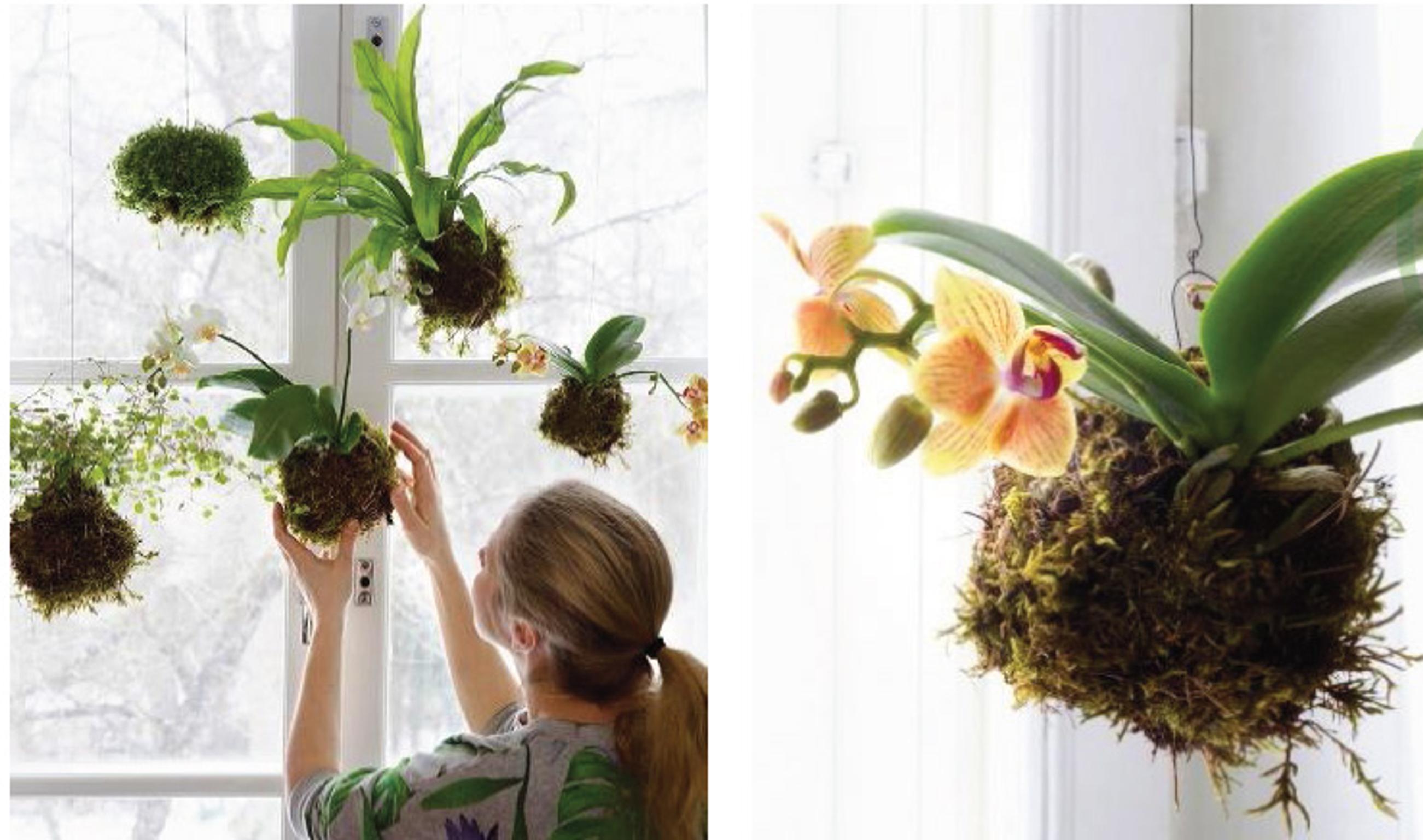 - Valitse sopusuhtaisia kasveja, jotka kestävät muotoilua. Esimerkiksi paavalinkukan lehdet katkeavat helposti. Anopinkielet ja kasvit, joilla on pitkät kankeat lehdet, eivät roiku nätisti. Orkideat ja saniaiset ovat hyviä, koska ne kasvavat luonnossakin puissa.