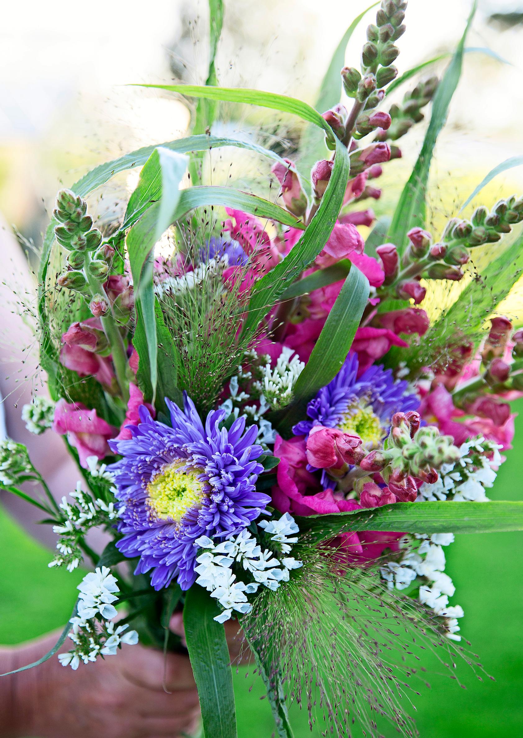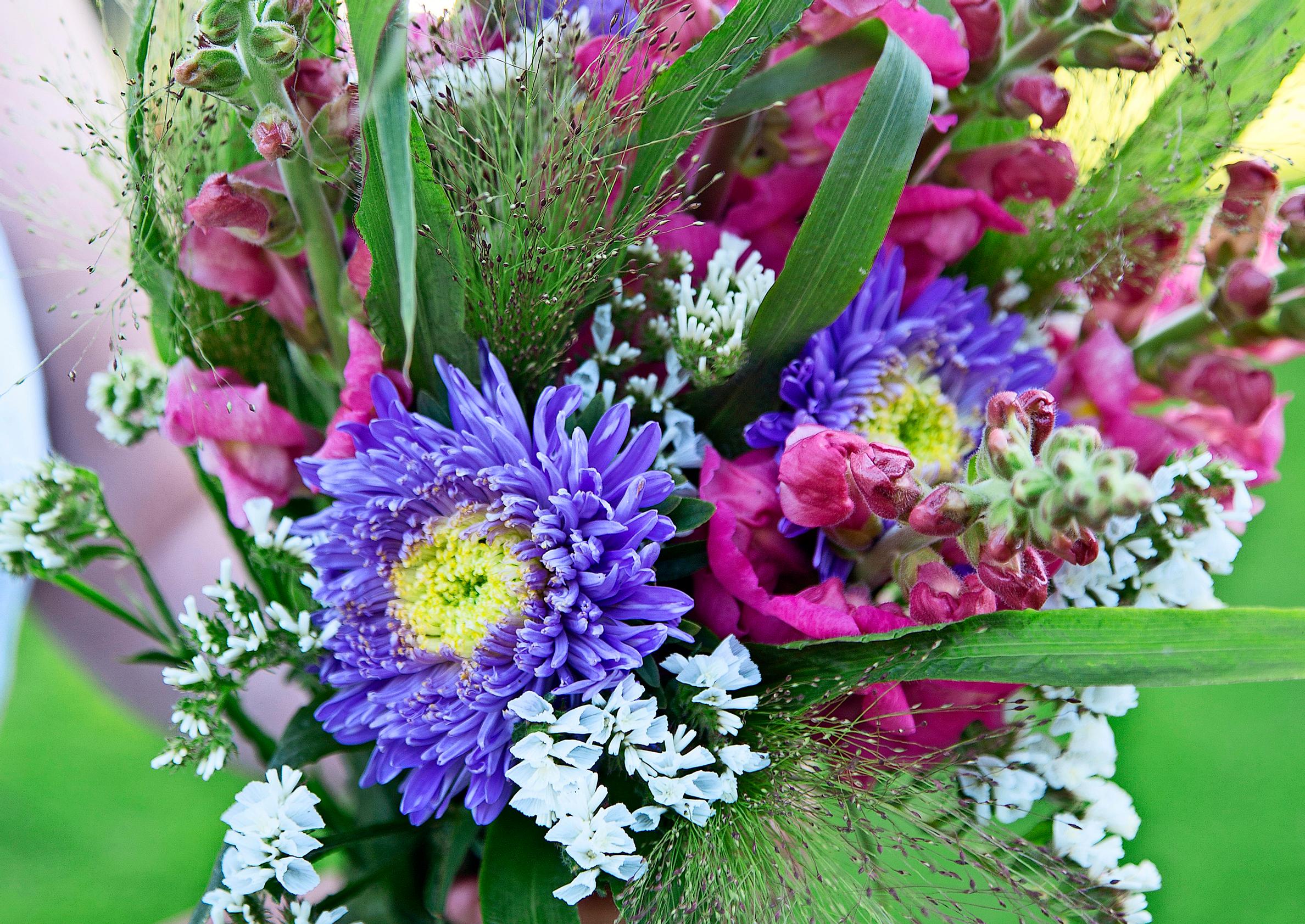 Rakkain kukkakimppu valmistuu oman puutarhan sadosta. Koristeheinät ja kauniin muotoiset lehdet keventävät kimppujen ilmettä.