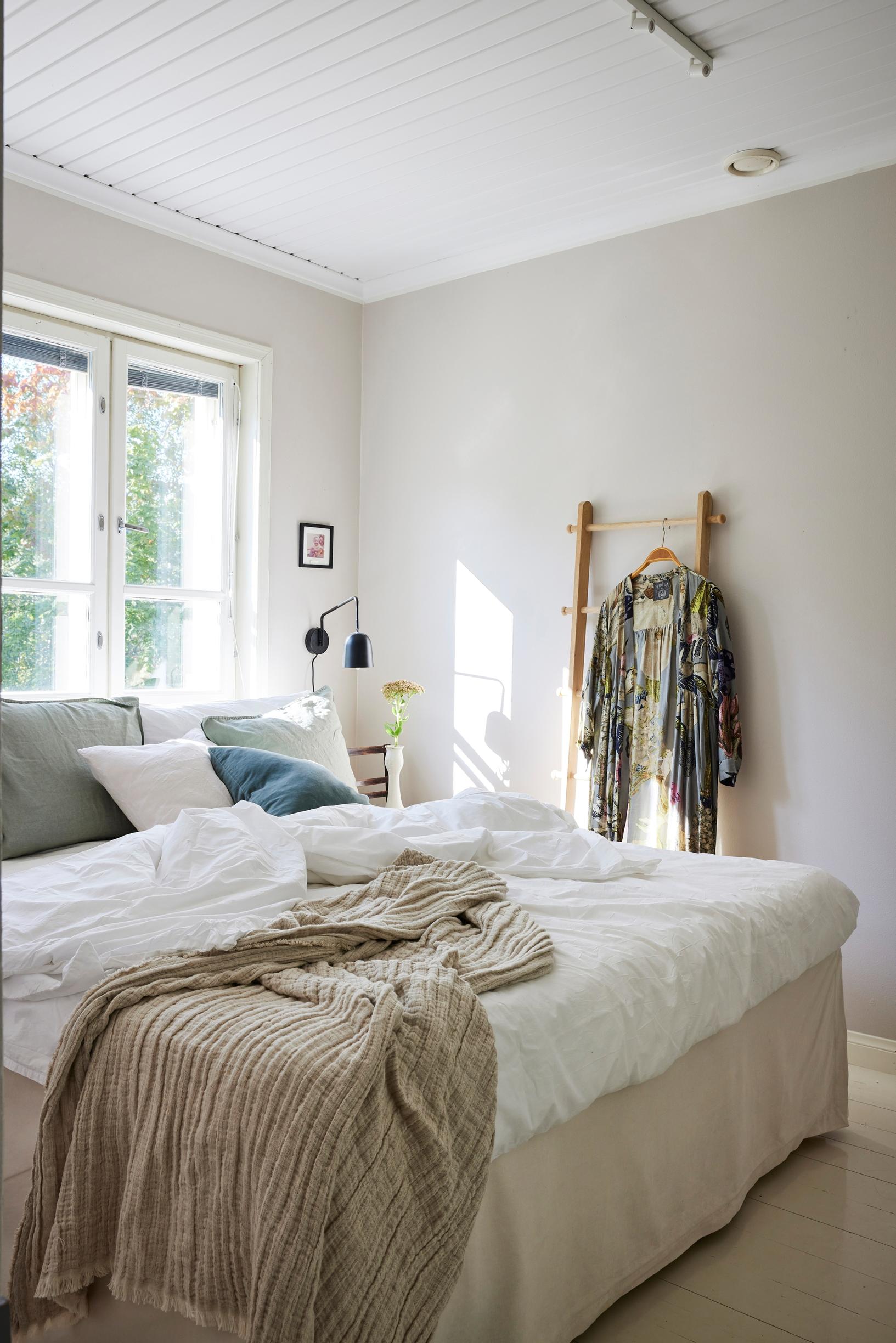 Kun muutimme taloomme kymmenen vuotta sitten, en miettinyt mitään muuta sävyä makkariin kuin lempeää Shaalia, sillä minulla oli siitä hyvät kokemukset. Kaipasin makuuhuoneeseen neutraalia, seesteistä ja hieman utuista, ikuisen sunnuntaiaamun tunnelmaa ja seiniä, joiden kanssa sopisivat monenväriset vuodevaatteet.
