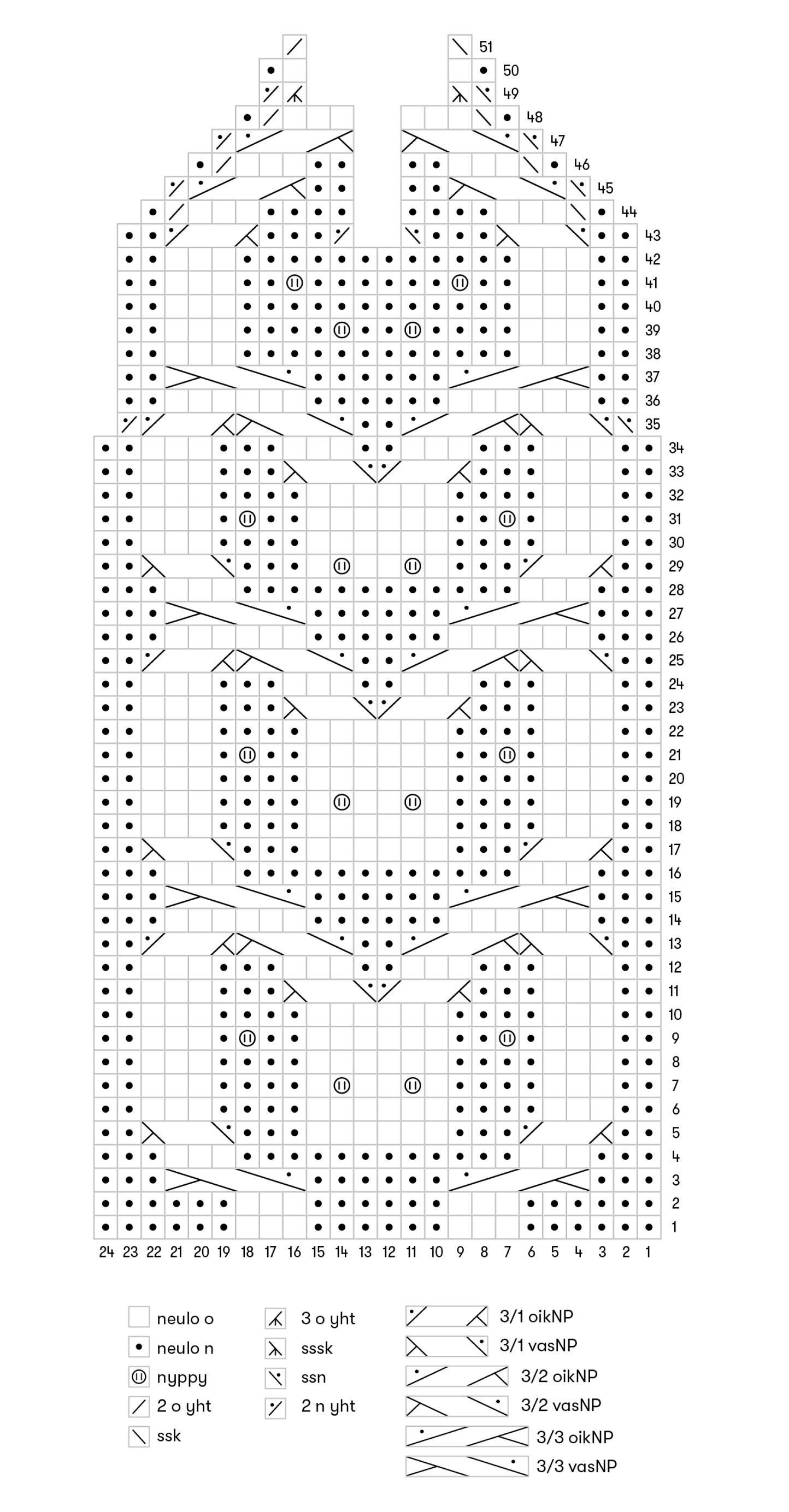 Vaihda työhön paksummat puikot (3,5 mm). Aloita palmikkokuvio kaavion mukaan. 24 s:n kuvio toistuu 5 krt jokaisella kerroksella. Neulo kaavion krs:t 1–51. Kun olet neulonut kaavion viimeisen krs:n, puikoilla on jäljellä 10 s. Katkaise langat ja pujota ne jäljellä olevien silmukoiden läpi. Kiristä tiukasti.