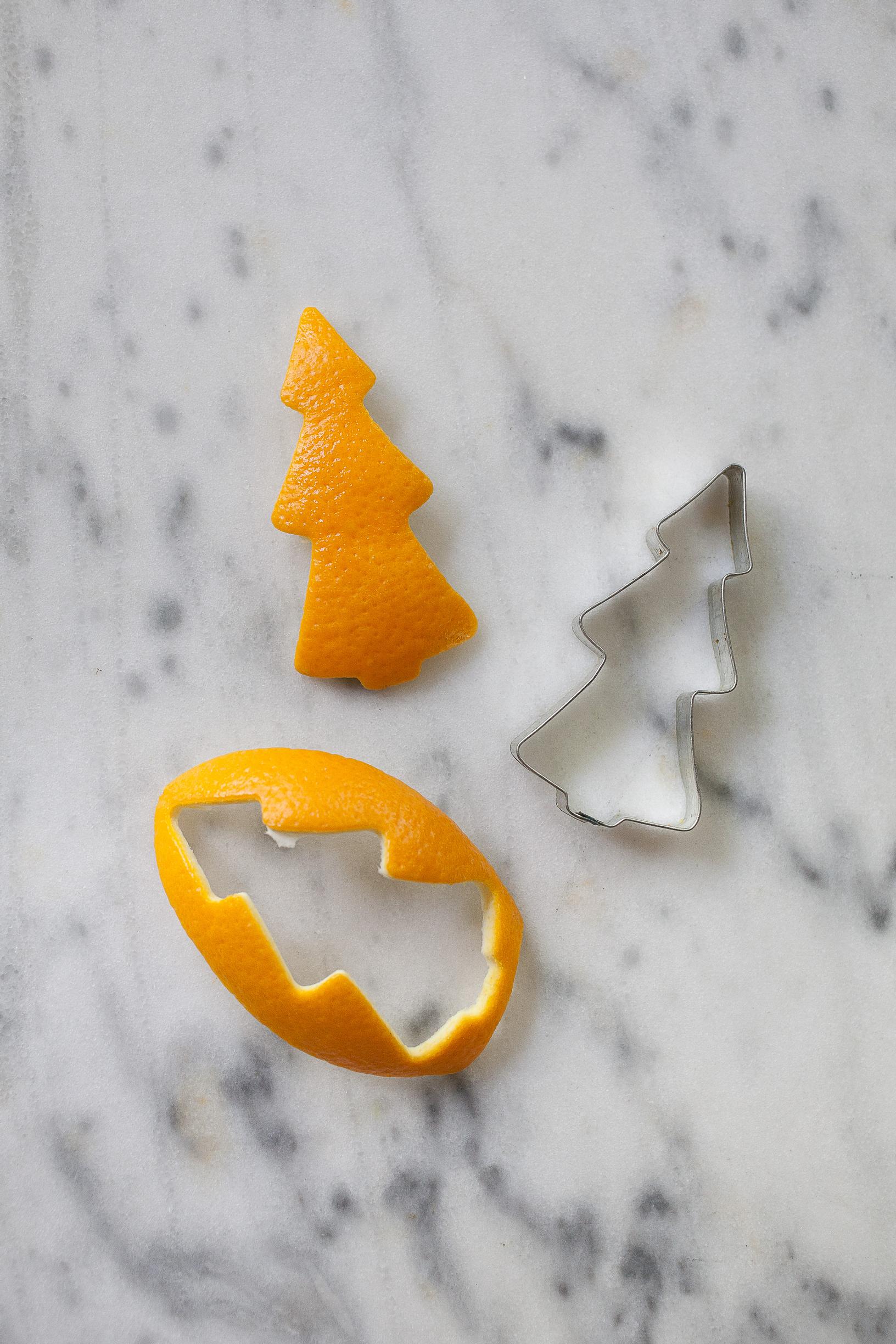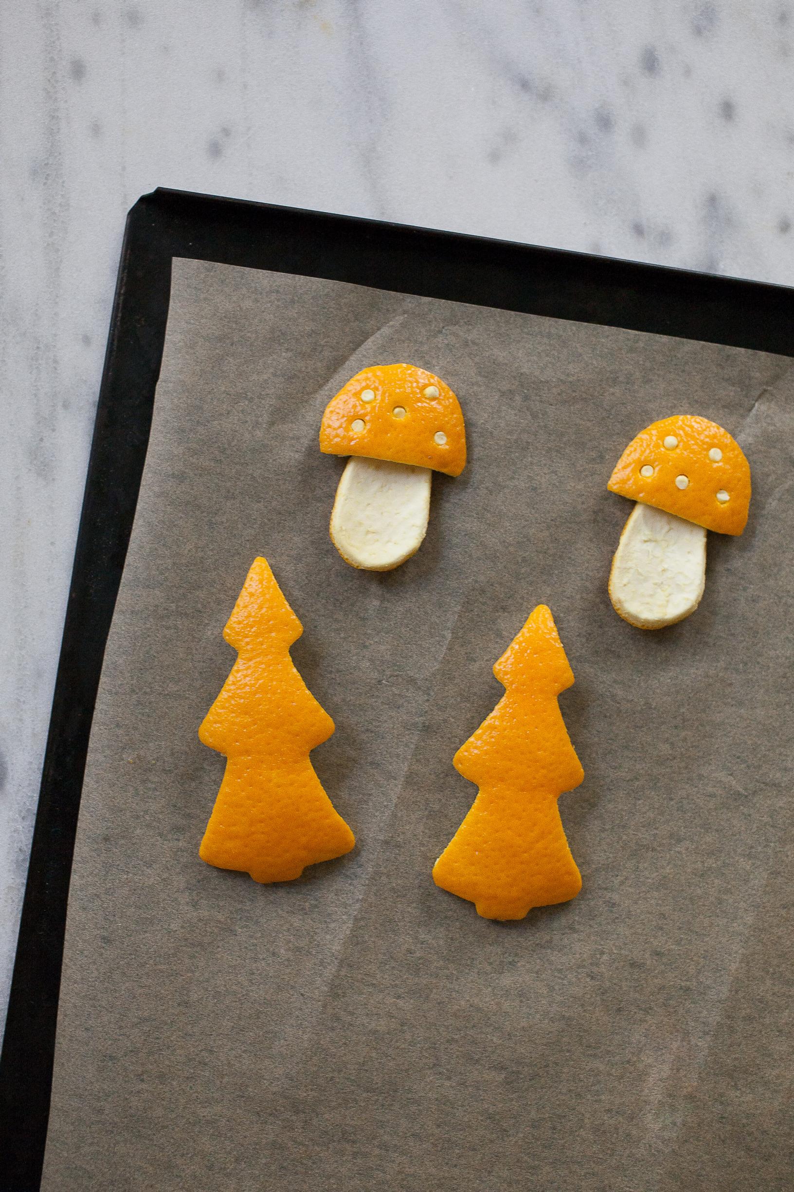 1. Kuori appelsiinit niin, että saat kuoret talteen pystysuuntaisina isoina paloina. Paina piparimuotilla kuorista kuusen muotoisia paloja. Oio ne niin hyvin kuin mahdollista pellille leivinpaperin päälle.