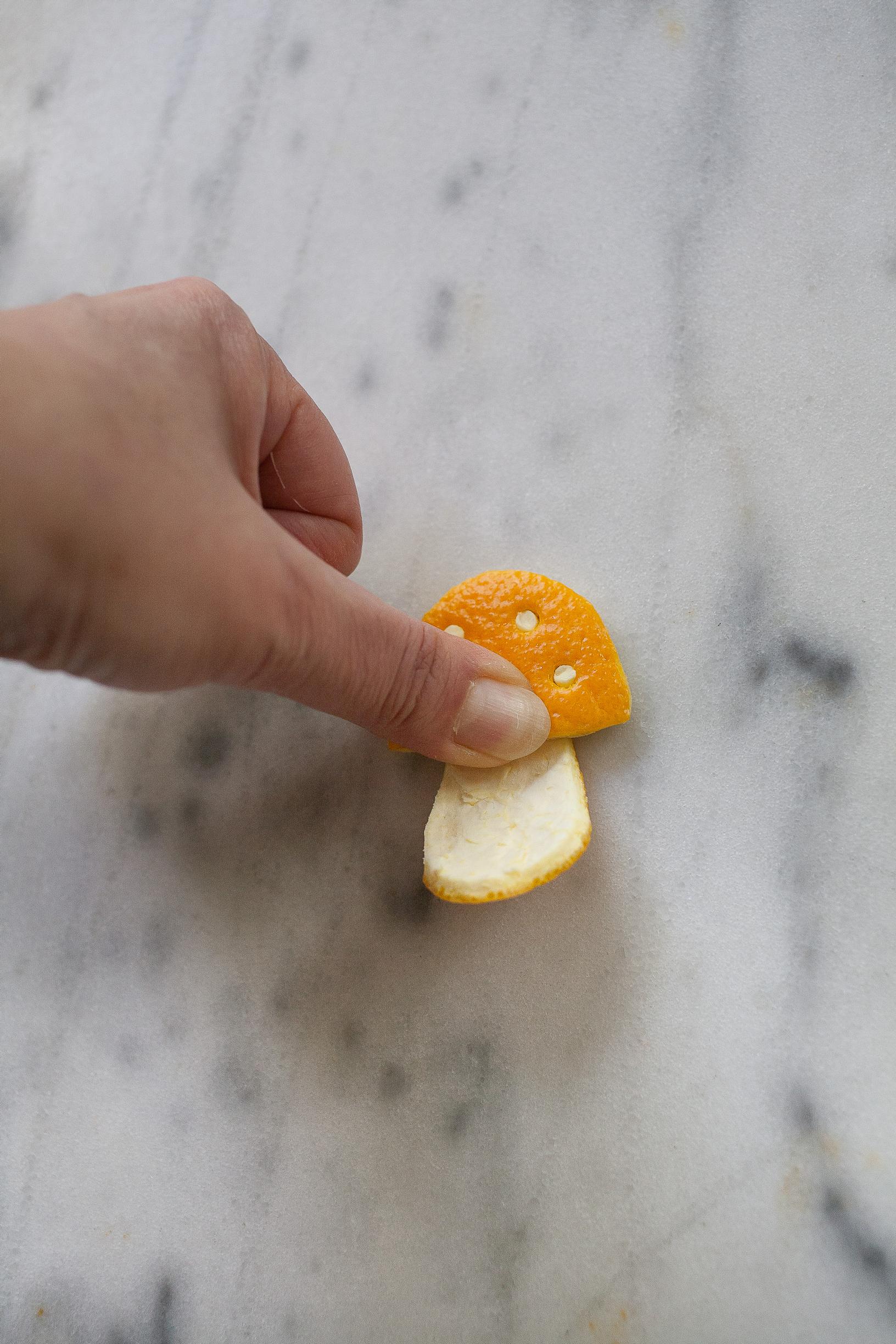 Kuivata appelsiininkuoria uunissa ja kokoa viiriksi. Saat sienten lakkeihin vaaleat pilkut hauskalla kääntötempulla.