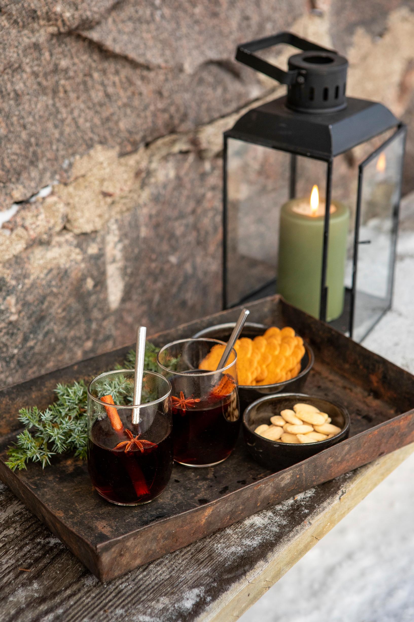 Mikä voisikaan lämmittää paremmin poskia kuin höyryävän kuuma glögi ja iloinen tunnelma? Kokoa tarjottimelle mukaan mieluisia herkkuja ja vietä pieni, hehkuva juhlatuokio läheisten kesken.