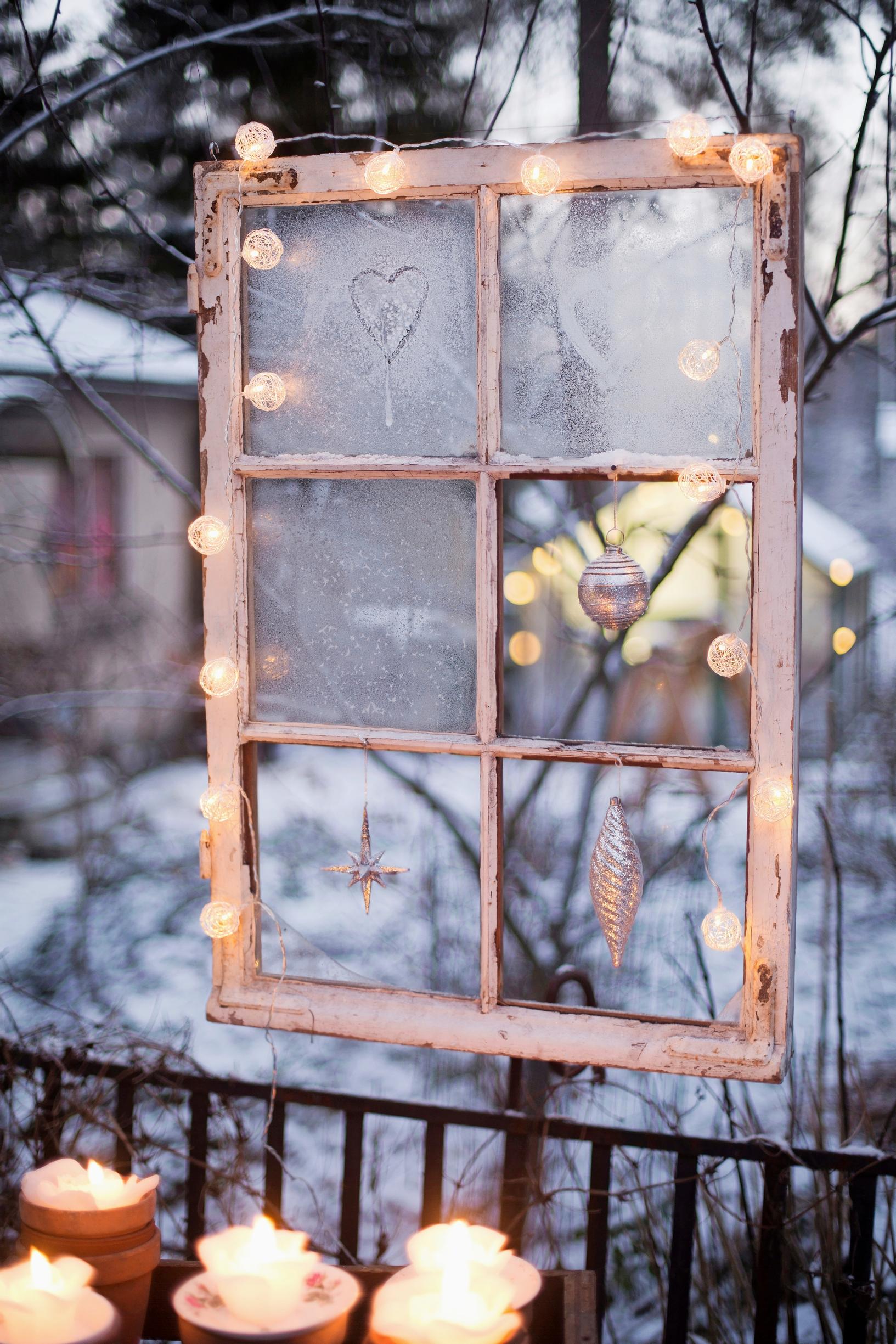 Osan lasiruuduistaan kadottanut ikkunanpoka on sievä kehys pihakoristeille. Ripusta se esimerkiksi puutarhakatoksen seinälle, kieputa siihen ulkovalosarjaa ja laita koristeita avoruutuihin. Pakkanen kuvioi lasit kuurankukilla. Kokoa ikkunan ääreen asetelma ruukuista, lautasista ja ruusukynttilöistä.