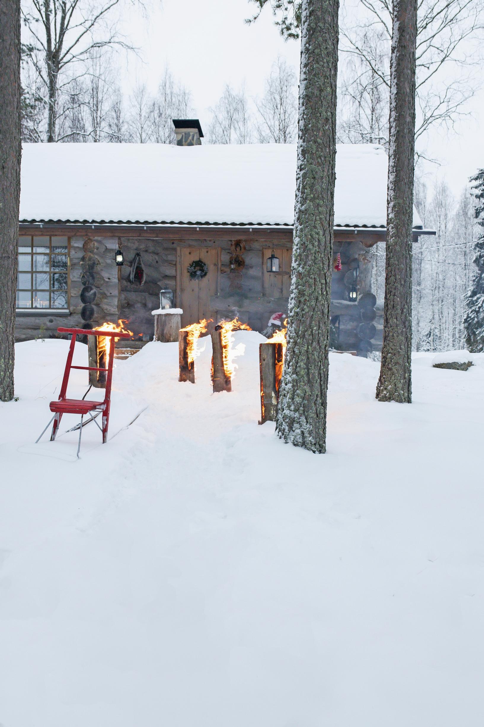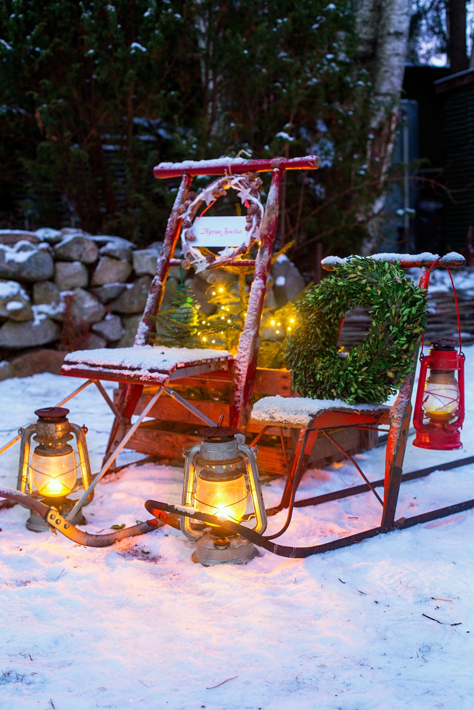 Saunapolun varteen pysäköidyt, myrskylyhdyin valaistut potkukelkat nostattavat joulumieltä. Ison potkurin jalaksille laskettu puulaatikko on täynnä valosarjalla somistettuja metsäkuusen taimia, jotka nostetaan aattona sisään koristeiksi. Potkurin puolassa roikkuvat talipallot ovat lahja linnuille. Lapsen kelkkaa koristaa puksipuukranssi.