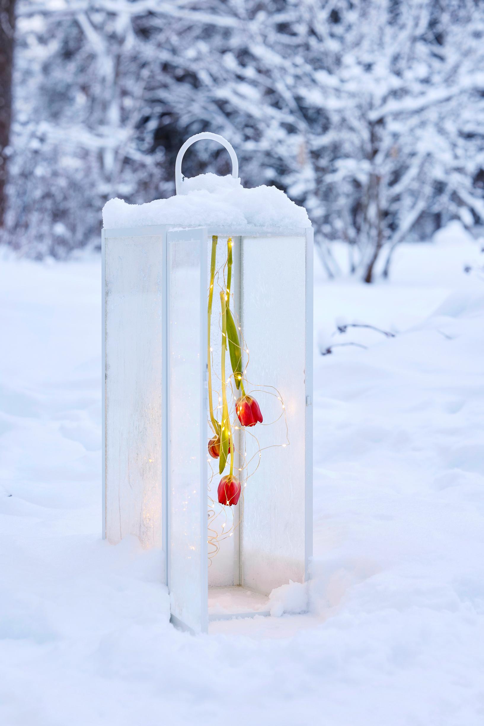 Kynttilälyhdystä, valonauhasta ja muutamasta tulppaanista syntyy herkkä pihakoriste, jonka pakkanen viimeistelee unohtumattomaksi.