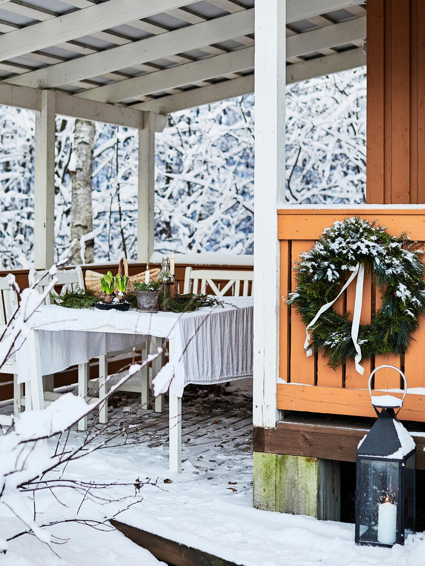 Somista myös kuisti tai piharakennus henkimään jouluista tunnelmaa. Voit hyödyntää helppoon koristeluun kransseja, lyhtyjä, koreja, hyasintteja ja havuja, mitä mieleen juolahtaa.
