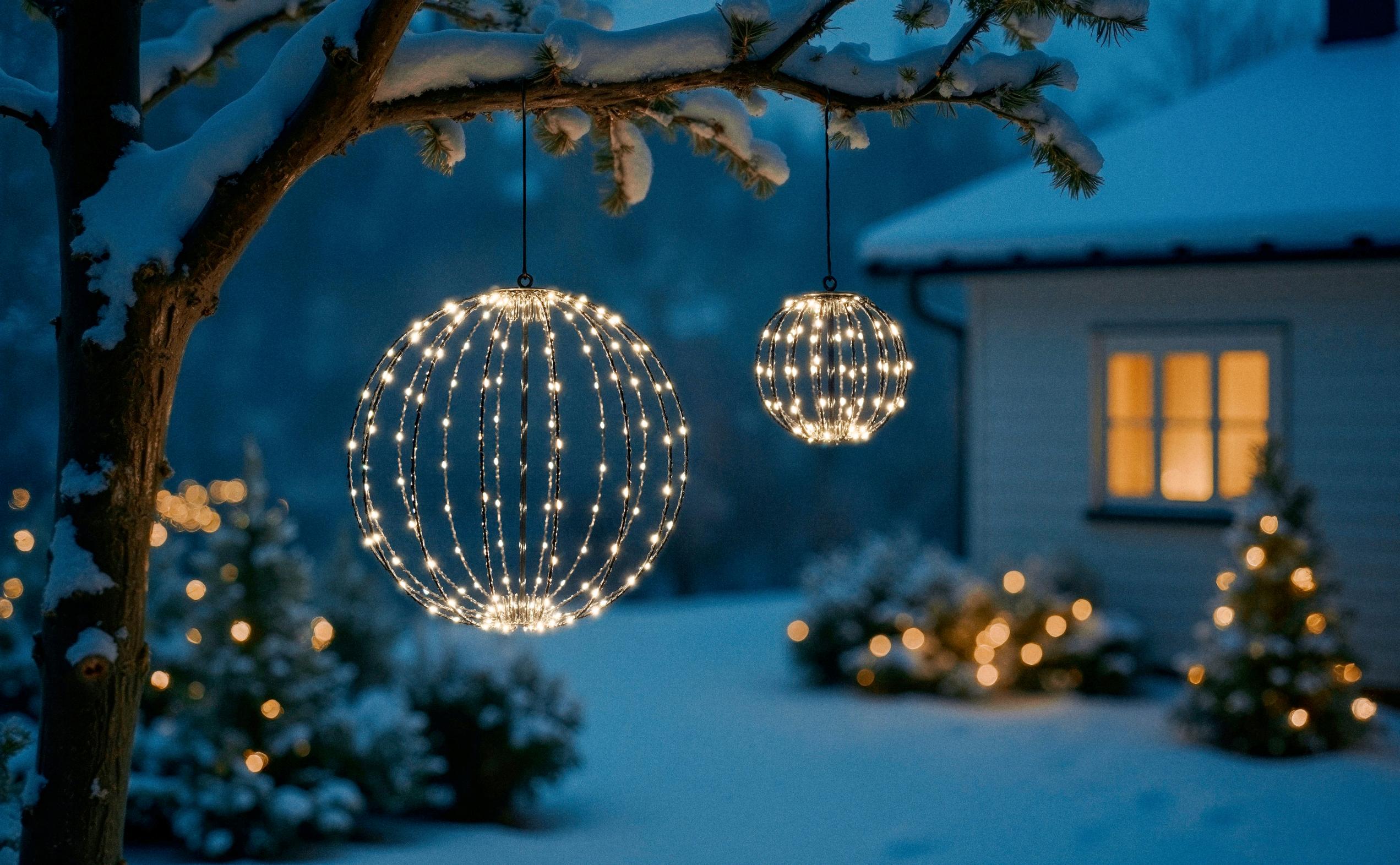 Puista riippuvat valopallot näyttävät satumaisilta. Ledeillä toimivan koristevalaisimen tai useita voi ripustaa pihapuun oksalle. Kuvan Globe-valaisin (halk. 37 cm) on Rustan.