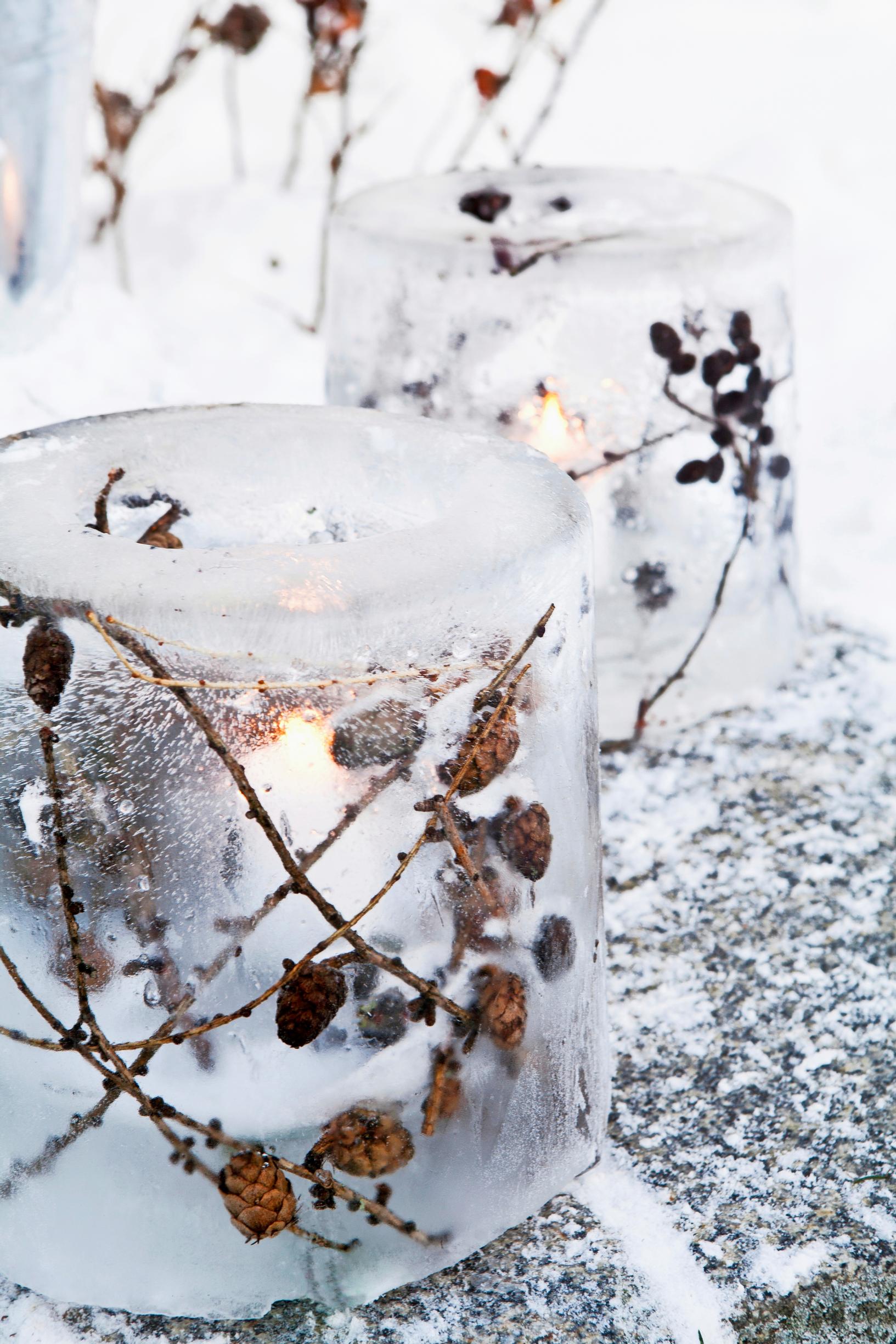 Korista jäälyhty lehtikuusen oksilla. Myös lepän oksista saat kauniin lyhdyn. Kokeile eripituisia jäädytysaikoja. Ohut jääkerros on kirkas ja kaunis mutta särkyy helposti. Sulata jäätynyt lyhty irti ämpäristä, tee reikä pohjaan ja kaada ylimääräinen vesi varovasti pois.