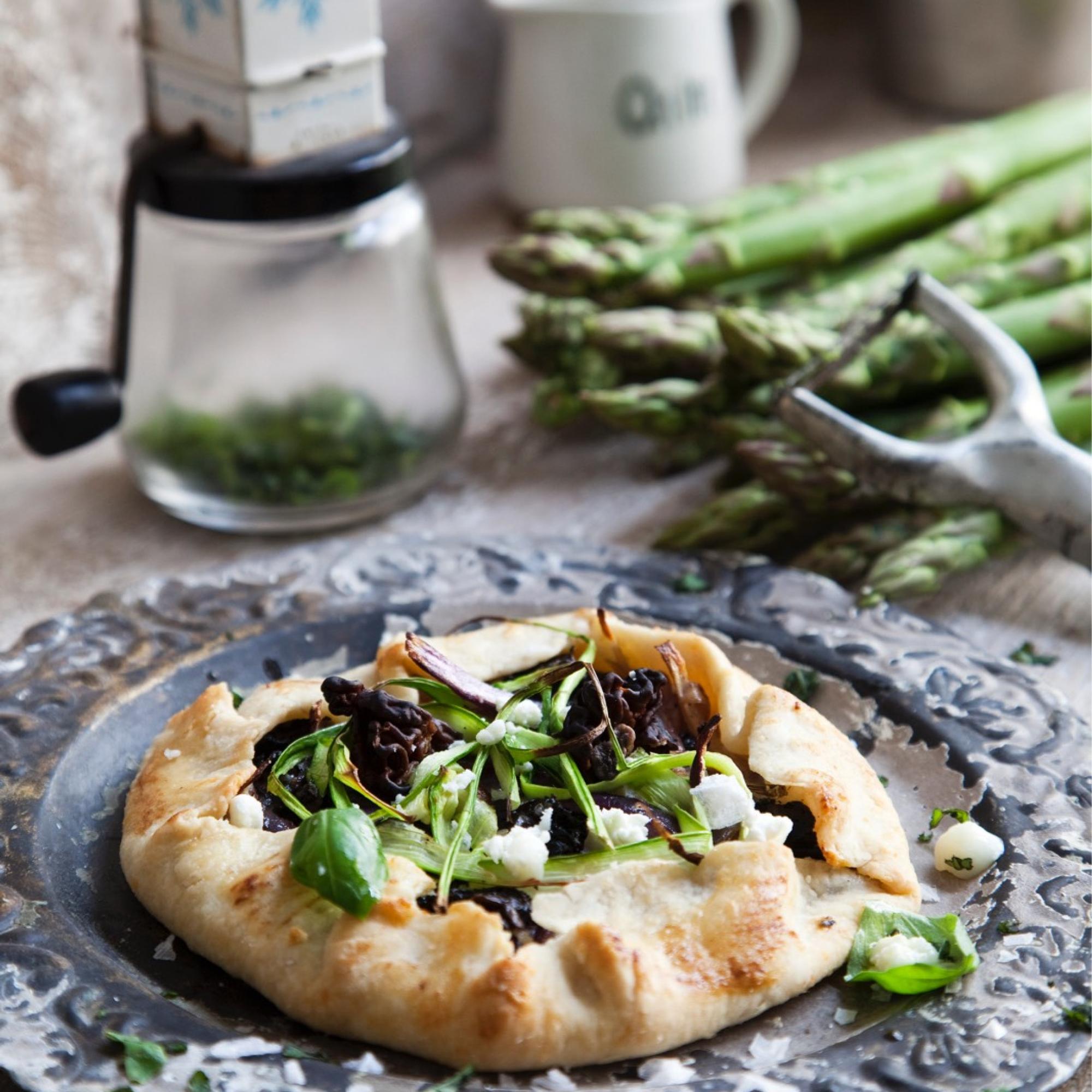 Leivo korvasienet galettepiirakan sisään. Kolmen sipulin galette saa lisämakua vuohenjuustosta ja kauniin koristelun toisesta kevään suosikista, parsasta.