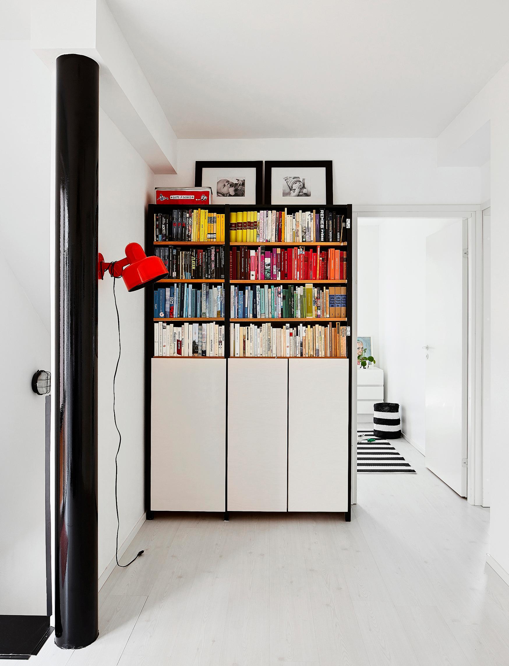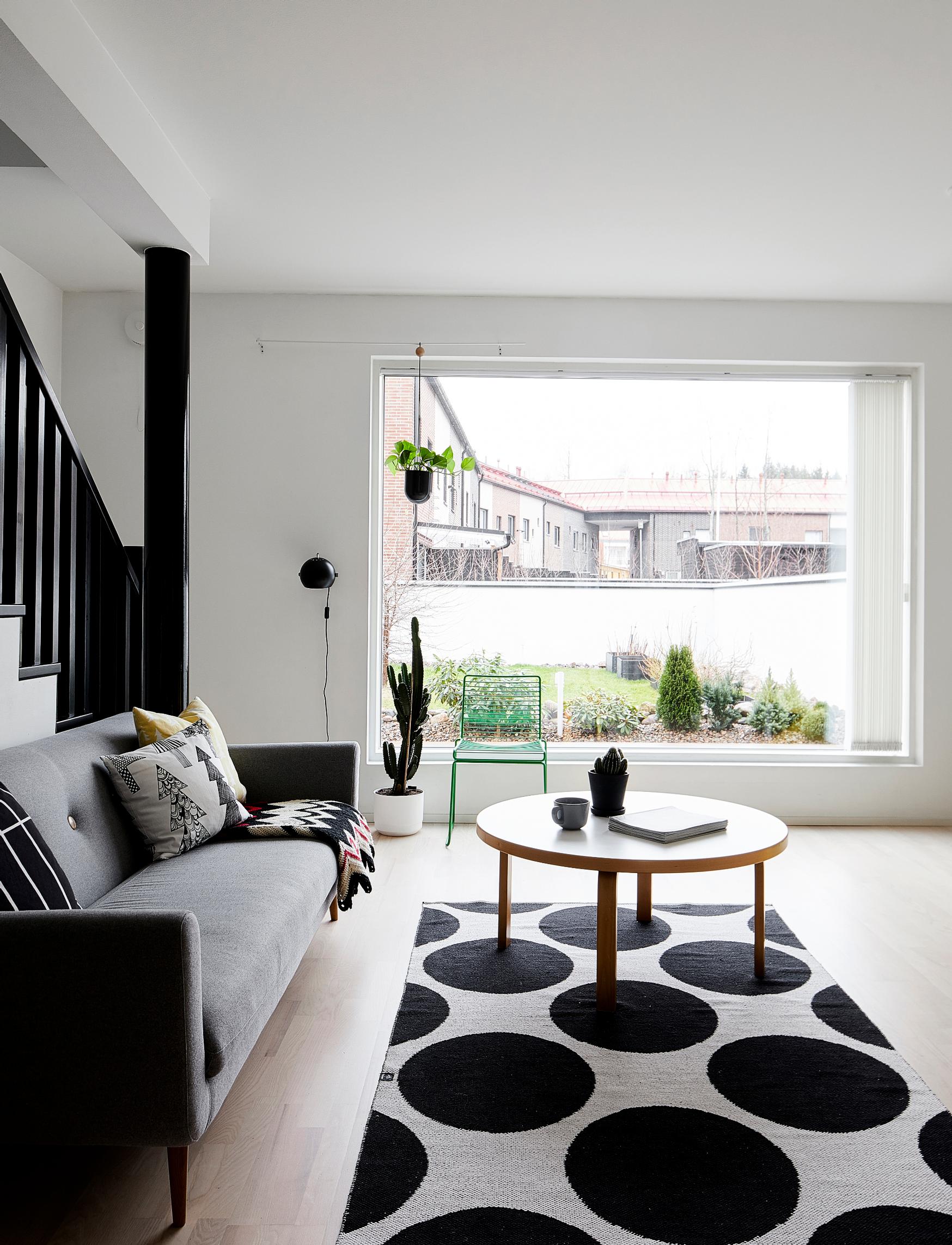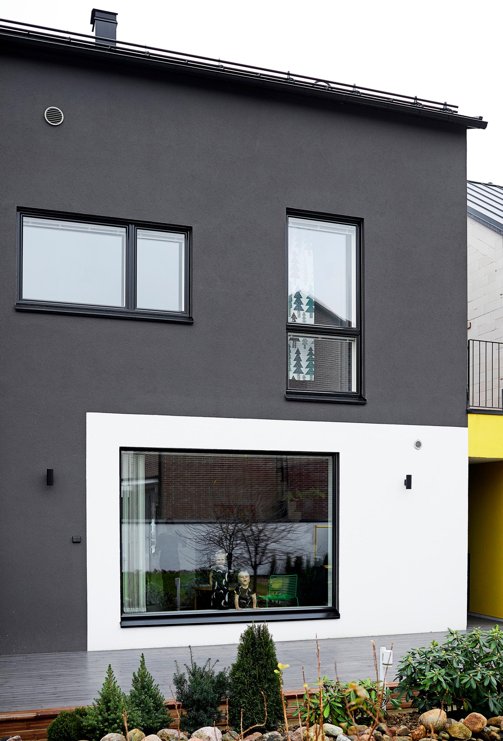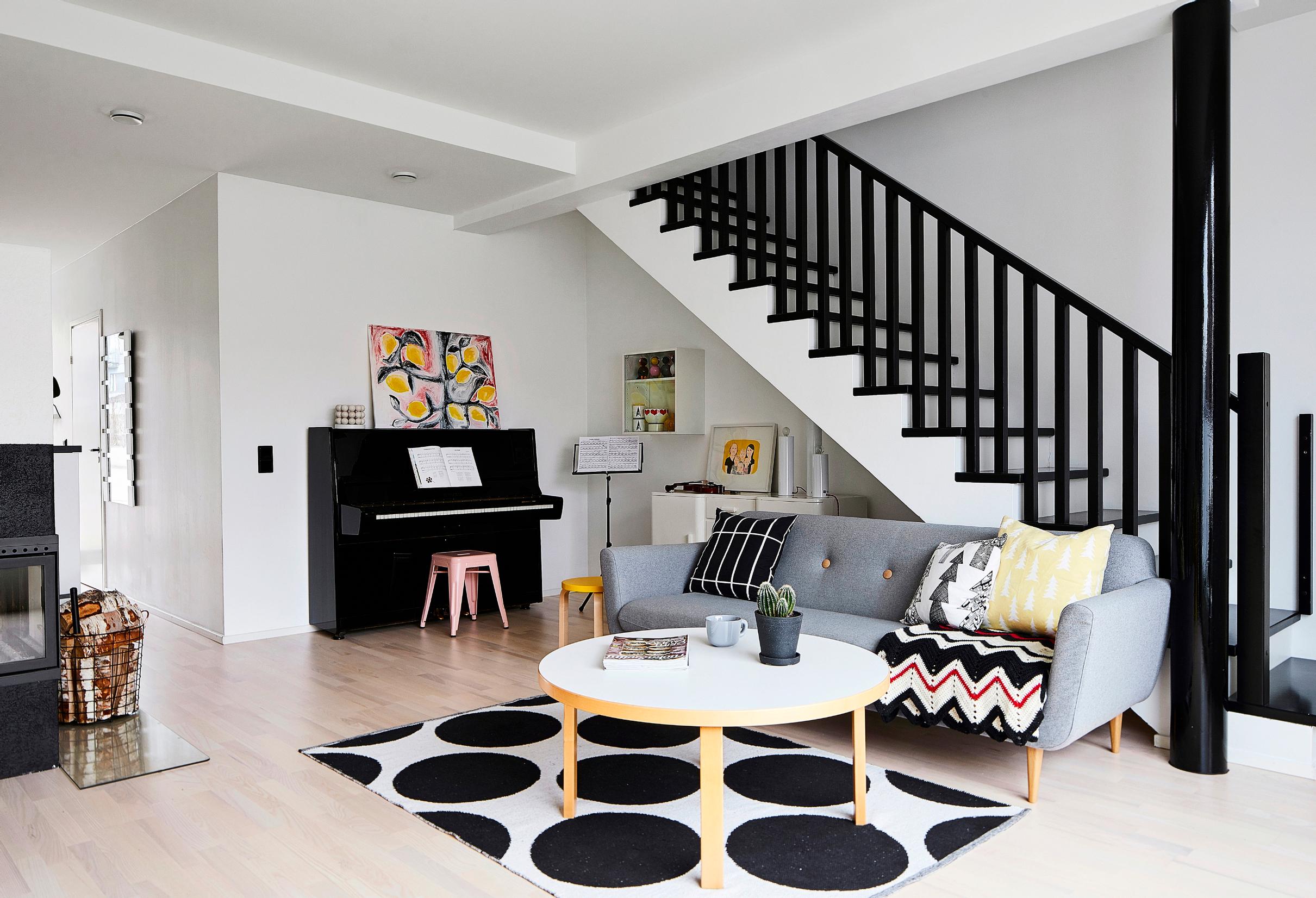 Kotimme on pinnoiltaan valkoinen, josta värit nousevat esiin. Musta kulkee läpi kodin yksityiskohdissa. Talon ulkopintakin on musta, kuten ikkunanpuitteet ulkoa. Portaikko toistaa mustaa väriä, samoin monet yksityiskohdat keittiössä ja rakenteissa.